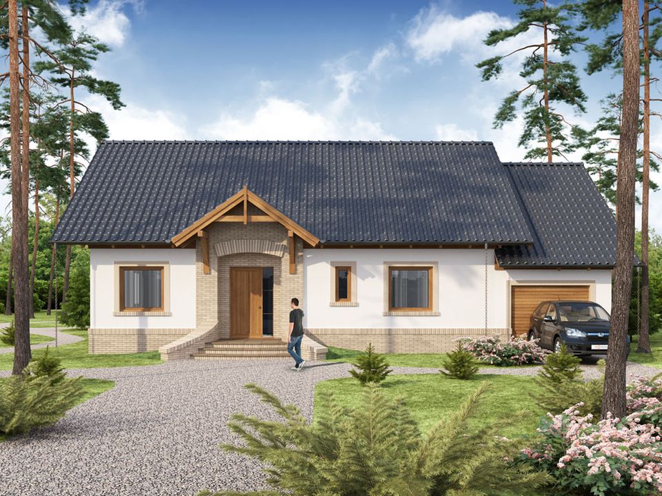 Wyborem odpowiedniego dla naszej rodziny projektu domu zajęła się moja żona, zaś do mnie należała kwestia jego realizacji. Przede wszystkim od początku zależało nam na domu parterowym, w którego bryle byłby uwzględniony garaż. Spośród tych, które spełniały te kryteria, mojej żonie najbardziej spodobał się projekt Elian PS WRW1195. Oprócz ciekawego wyglądu i funkcjonalnego wnętrza, wpływ na decyzję miało również to, iż architekt przewidział wykonanie osobnej, praktycznej pralni.Zdecydowaliśmy się na budowę systemem gospodarczym. Nie zatrudnialiśmy firmy, a całą realizacją zająłem się wraz z moim tatą. Nie mieliśmy w związku z nią żadnych problemów i do technicznej strony projektu także nie mam zastrzeżeń. Inwestycja przebiegła sprawnie i zgodnie z wcześniej założonym planem. Od rozpoczęcia budowy do zakończenia wszelkich prac wykończeniowych minął dokładnie 1 rok i 2 miesiące.Budynek został wymurowany z ceramicznych pustaków Porotherm, strop wykonaliśmy w drewnianej konstrukcji, zaś dach pokryliśmy dachówką ceramiczną. Trudno odnieść mi się do poprawności oszacowanego przez architekta kosztorysu, ponieważ ze względu na ogromny wkład własnej pracy, zaoszczędziliśmy na robociźnie. Koszty realizacji były więc w naszym przypadku znacznie niższe i nie jestem w stanie stwierdzić jak wyglądałyby w przypadku zatrudnienia profesjonalnej firmy. Cała inwestycja, łącznie z wszystkimi wykończeniami, umeblowaniem i wyposażeniem w domu we wszystkie niezbędne sprzęty wyniosło ok. 280 tys. zł.Projekt Elian PS WRW1195 przewiduje wykonanie spiżarki, aczkolwiek jej wymiary są dosyć niewielkie, dlatego też żona uznała że takie pomieszczenie jest zbędne. Postanowiliśmy więc z niego zrezygnować, a jego pierwotną powierzchnię przyłączyliśmy do kuchni. Oprócz tego, wstawiliśmy na poddaszu dwa okna.Zdecydowaliśmy się na projekt w wersji lustrzanego odbicia. Dom usytuowany jest na działce w ten sposób, iż front znajduje się od strony północnej, zaś duże drzwi tarasowe wychodzą na południe. Przy takim ułożeniu we wszystkich pomieszczeniach mieszkalnych mamy wystarczająco jasno, aczkolwiek dodatkowe okna z pewnością przydałyby się w garażu. Niestety, gdy to przewidziałem było już za późno na zmianę, ale innym Inwestorom szczerze polecam jej wprowadzenie na etapie adaptacji.Wybór projektu Elian PS WRW1195 był świetną decyzją. Wewnętrzny układ domu w całości spełnia wszystkie nasze potrzeby. Rozmieszczenie pomieszczeń zostało bardzo dobrze przemyślane i nie mam w tej kwestii żadnych zastrzeżeń. Cała nasza rodzina jest bardzo zadowolona z nowego domu. Pozdrawiam.