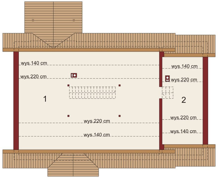 Fundamenty: bezpośrednie, na ławach i stopach fundamentowych. Ściany zewnętrzne: bloczki z bet. komórkowego - 24 cm + styropian TERMO ORGANIKA typ Fasada 16 cm. Ściany wewnętrzne: bloczki z bet. komórkowego - 24 cm (działowe - 12 cm). Strop: belki drewniane (ocieplenie ISOVER Super Mata). Elewacje: tynk - System Platinum firmy TERMO ORGANIKA, płytki klinkierowe, deska elewacyjna. Pokrycie dachu: dachówka cementowa zakładkowa. Konstrukcja dachu: drewniana o układzie konstrukcyjnym mieszanym. Schody wewnętrzne: wyłaz na poddasze. Ogrzewanie: kocioł gazowy kondensacyjny lub kocioł na paliwo stałe dodatkowe źródło ciepła - kominek z płaszczem wodnym. Projekt jest zgodny z wymaganiami WT2021, a konstrukcja była obliczana zgodnie z eurokodami.