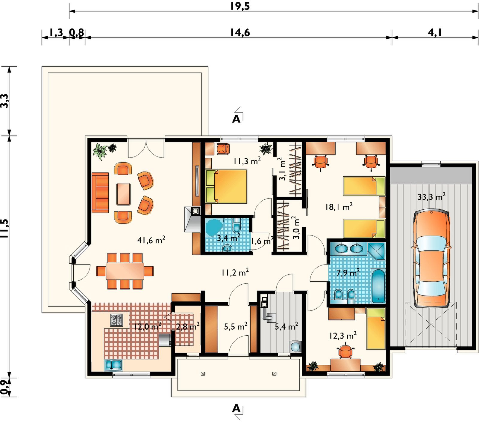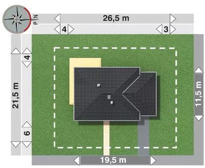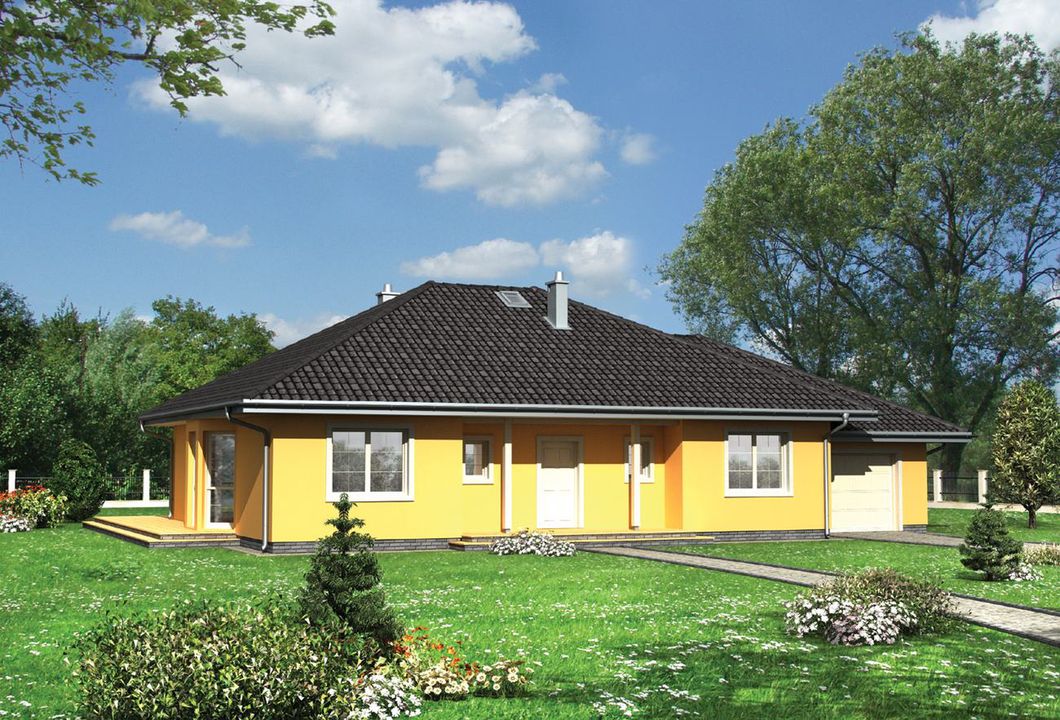 Graficzne opracowanie rzutów poglądowych widocznych na karcie projektu zostało wykonane przez Extradom.pl. Prezentowane przez Extradom.pl wizualizacje wykonane zostały przez autora projektu i należy poczytywać je jedynie za przykład i propozycję wykończenia, wizję architektoniczną autora projektu. Ostateczne wykończenie budynku może nastąpić na wiele sposobów. Szczegółowe rozwiązania zastosowane w oferowanej dokumentacji - w tym również ilość, lokalizacje i wygląd okien, drzwi, kominów - mogą w niewielkim stopniu różnić się od prezentowanej wizualizacji budynku.