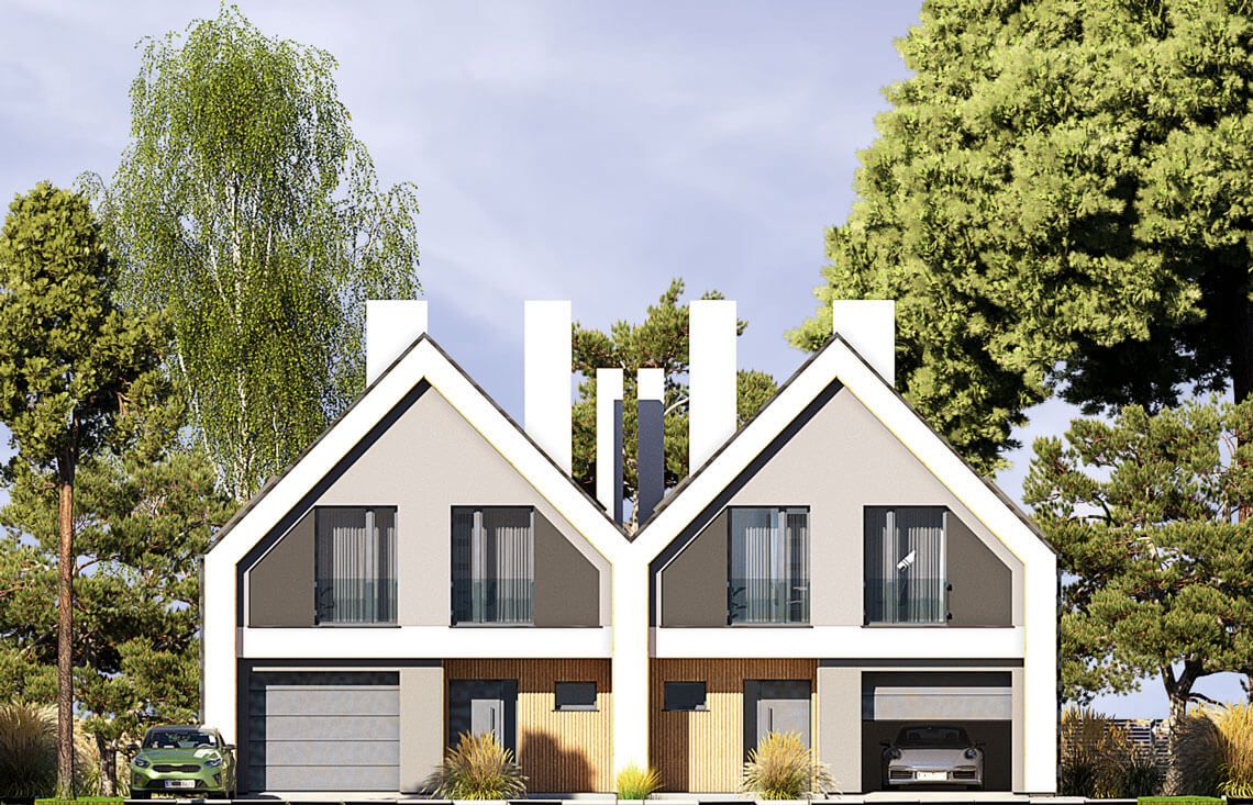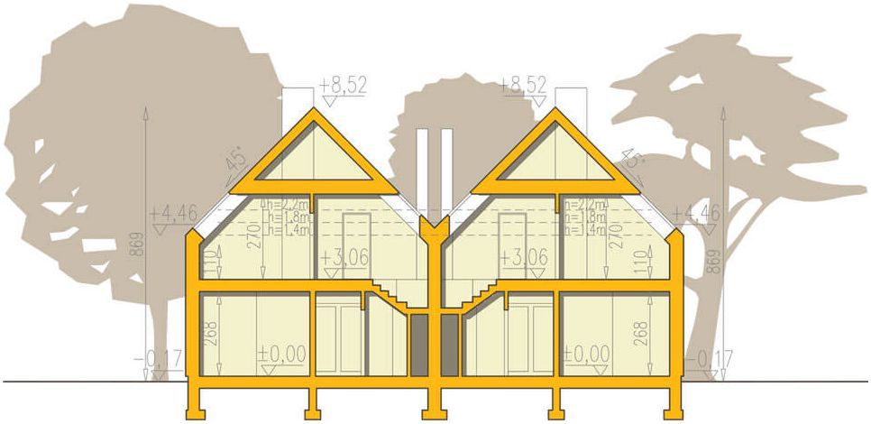 Ściany: bloczek z gazobetonu 24 cm, styropian Termo Organika 20 cm, tynk ściany pomiędzy segmentami: bloczek silikatowy 18cm, dylatacja – styropian 2cm, pustka powietrzna 2cm, bloczek silikatowy 18cm. Strop: teriva. Dach: dwuspadowy, nachylenie 45°, więźba drewniana, blacha dachowa lub dachówka ceramiczna. Ocieplenie dachu: wełna mineralna. Ogrzewanie: gazowe (pompa ciepła, paliwo stałe – płatne dodatki) wentylacja: grawitacyjna (rekuperacja – płatny dodatek).