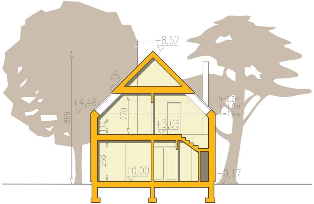 Ściany: bloczek z gazobetonu 24 cm, styropian Termo Organika 20 cm, tynk ściany pomiędzy segmentami: bloczek silikatowy 18cm, dylatacja – styropian 2cm, pustka powietrzna 2cm, bloczek silikatowy 18cm. Strop: teriva. Dach: dwuspadowy, nachylenie 45°, więźba drewniana, blacha dachowa lub dachówka ceramiczna. Ocieplenie dachu: wełna mineralna. Ogrzewanie: gazowe (pompa ciepła, paliwo stałe – płatne dodatki) wentylacja: grawitacyjna (rekuperacja – płatny dodatek).