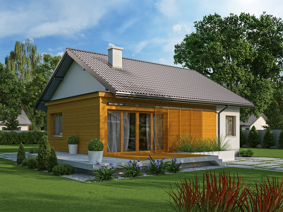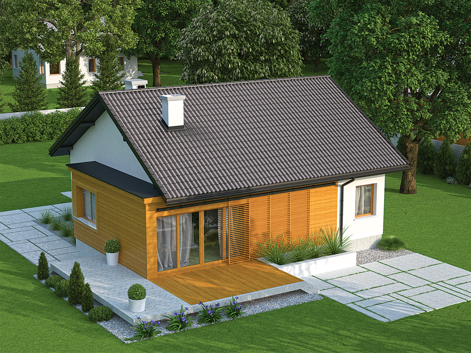 Ściany zewnętrzne: murowane, ściany zewnętrzne dwuwarstwowe, docieplenie grubości 20 cm. Strop: gęstożebrowy. Dach: konstrukcja drewniana, ocieplenie wełna mineralna, dachówka cementowa IBF. Więźba dachowa dostępna również w systemie prefabrykacji drewnianej. Ogrzewanie: kocioł gazowy, rozprowadzenie ciepła: grzejniki. Wentylacja: grawitacyjna. Elewacje: tynk cienkowarstwowy mineralny oraz okładzina drewniana. Stolarka: drewniana, PCV lub aluminiowa. Rolety zewnętrzne w systemie CleverBox firmy BeClever Otoczenie : system tarasowy ProDeck - deska kompozytowa Terra w kolorze orzech.