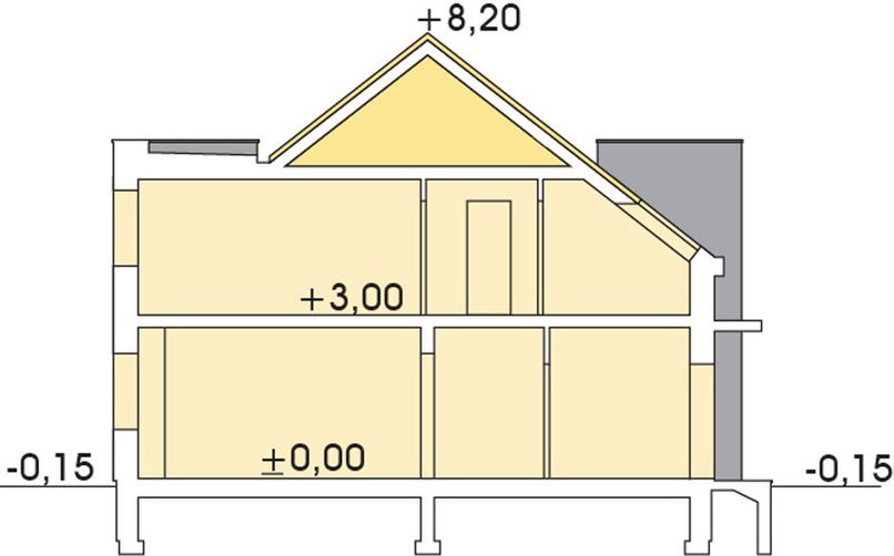 Strop: żelbetowy monolityczny. Ściany zewnętrzne: pustaki ceramiczne 25cm + styropian 20cm. Pokrycie dachowe: dachówka ceramiczna. Okna połaciowe: Velux.