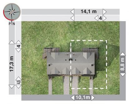 Graficzne opracowanie rzutów poglądowych widocznych na karcie projektu zostało wykonane przez Extradom.pl. Prezentowane przez Extradom.pl wizualizacje wykonane zostały przez autora projektu i należy poczytywać je jedynie za przykład i propozycję wykończenia, wizję architektoniczną autora projektu. Ostateczne wykończenie budynku może nastąpić na wiele sposobów. Szczegółowe rozwiązania zastosowane w oferowanej dokumentacji - w tym również ilość, lokalizacje i wygląd okien, drzwi, kominów - mogą w niewielkim stopniu różnić się od prezentowanej wizualizacji budynku.