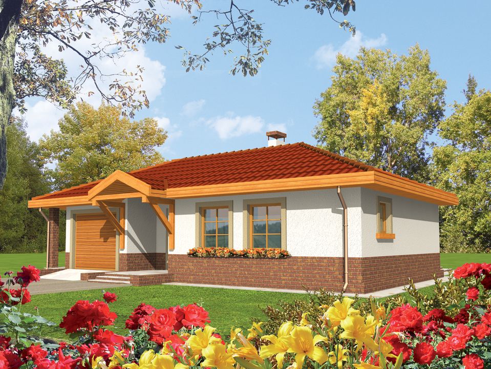 Ściany zewnętrzne: murowane. Dach: wiązary, dachówka cementowa lub ceramiczna. Więźba dachowa dostępna również w systemie prefabrykacji drewnianej.. Ogrzewanie: kocioł gazowy, rozprowadzenie ciepła: grzejniki. Wentylacja: grawitacyjna. Elewacje: tynk strukturalny, słupki i kominy z cegły klinkierowej, cokół – płytki klinkierowe. Stolarka: drewniana lub PCV.