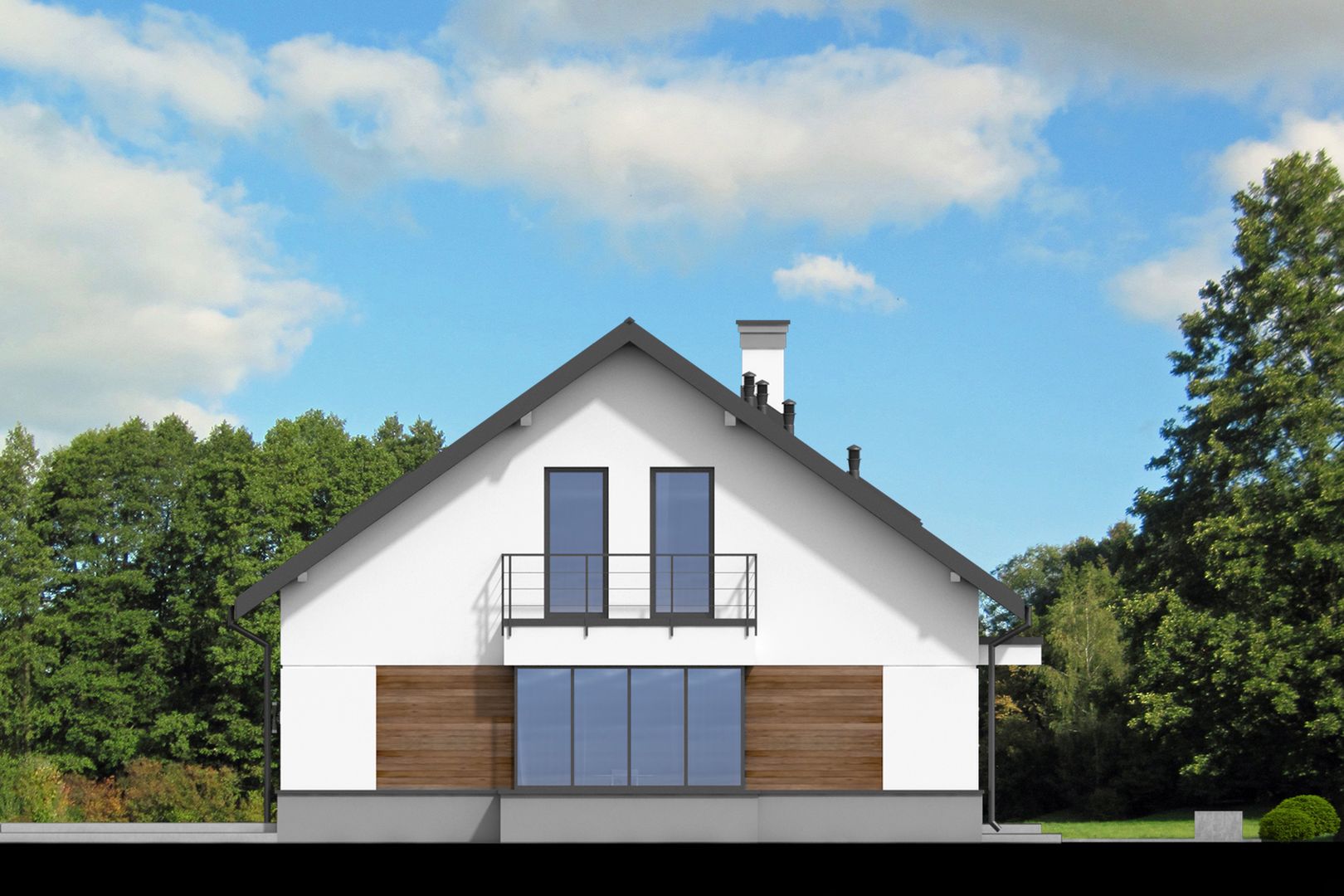 Graficzne opracowanie rzutów poglądowych widocznych na karcie projektu zostało wykonane przez Extradom.pl. Prezentowane przez Extradom.pl wizualizacje wykonane zostały przez autora projektu i należy poczytywać je jedynie za przykład i propozycję wykończenia, wizję architektoniczną autora projektu. Ostateczne wykończenie budynku może nastąpić na wiele sposobów. Szczegółowe rozwiązania zastosowane w oferowanej dokumentacji - w tym również ilość, lokalizacje i wygląd okien, drzwi, kominów - mogą w niewielkim stopniu różnić się od prezentowanej wizualizacji budynku.
