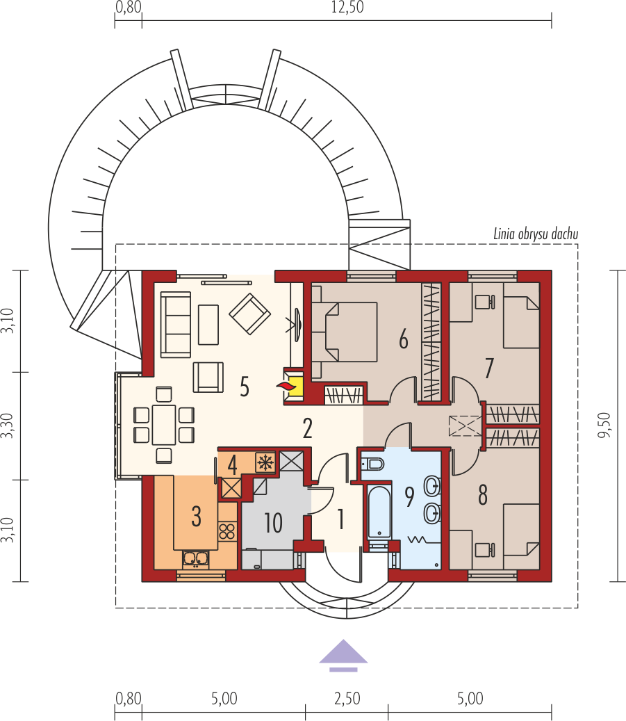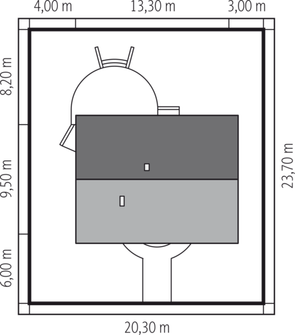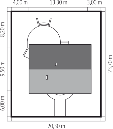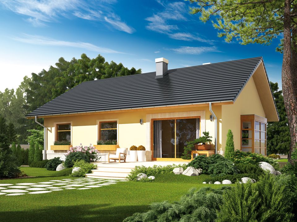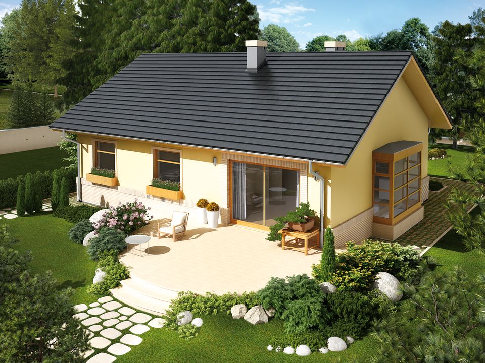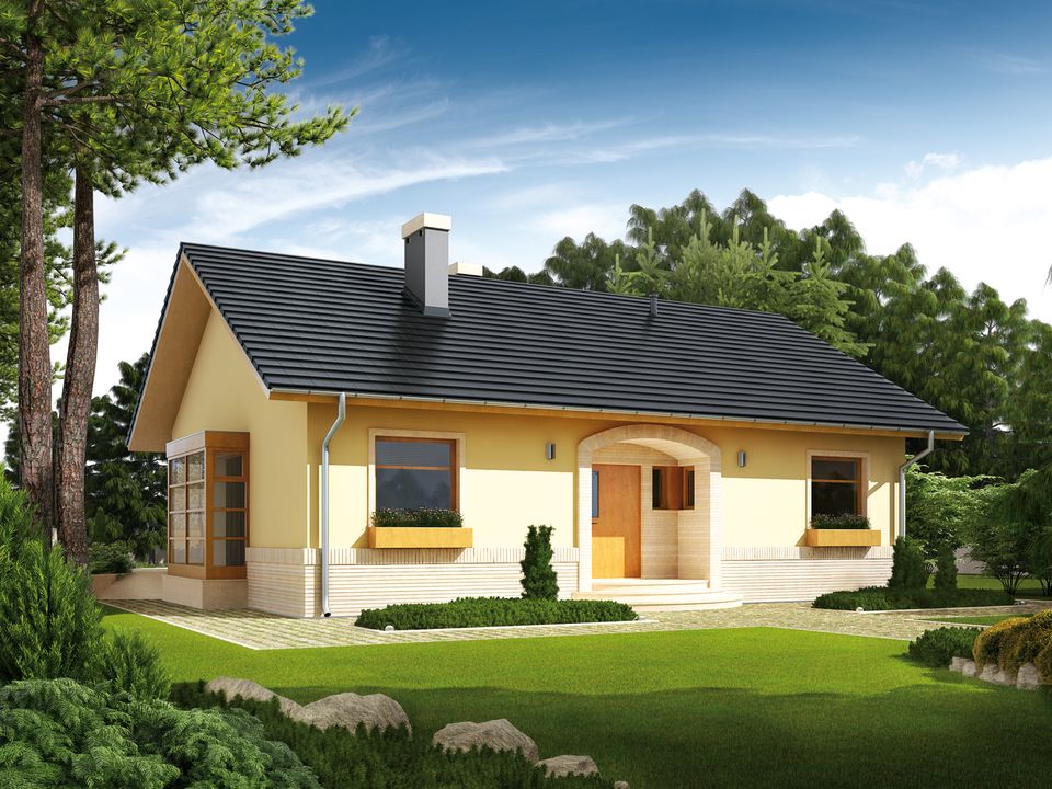 Graficzne opracowanie rzutów poglądowych widocznych na karcie projektu zostało wykonane przez Extradom.pl. Prezentowane przez Extradom.pl wizualizacje wykonane zostały przez autora projektu i należy poczytywać je jedynie za przykład i propozycję wykończenia, wizję architektoniczną autora projektu. Ostateczne wykończenie budynku może nastąpić na wiele sposobów. Szczegółowe rozwiązania zastosowane w oferowanej dokumentacji - w tym również ilość, lokalizacje i wygląd okien, drzwi, kominów - mogą w niewielkim stopniu różnić się od prezentowanej wizualizacji budynku.