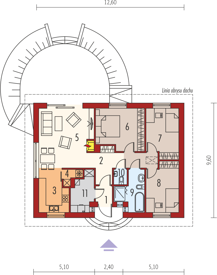 Graficzne opracowanie rzutów poglądowych widocznych na karcie projektu zostało wykonane przez Extradom.pl. Prezentowane przez Extradom.pl wizualizacje wykonane zostały przez autora projektu i należy poczytywać je jedynie za przykład i propozycję wykończenia, wizję architektoniczną autora projektu. Ostateczne wykończenie budynku może nastąpić na wiele sposobów. Szczegółowe rozwiązania zastosowane w oferowanej dokumentacji - w tym również ilość, lokalizacje i wygląd okien, drzwi, kominów - mogą w niewielkim stopniu różnić się od prezentowanej wizualizacji budynku.