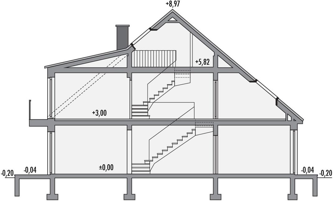 Strop: gęstożebrowy Teriva I. Ściany zewnętrzne: pustaki ceramiczne 25cm + styropian 14cm. Pokrycie dachowe: dachówka ceramiczna. Okna połaciowe: velux.