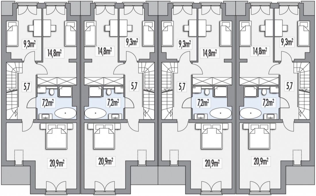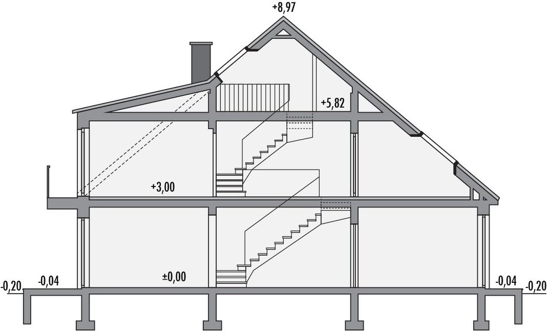 Strop: gęstożebrowy Teriva I. Ściany zewnętrzne: pustaki ceramiczne 25cm + styropian 14cm. Pokrycie dachowe: dachówka ceramiczna. Okna połaciowe: Velux.