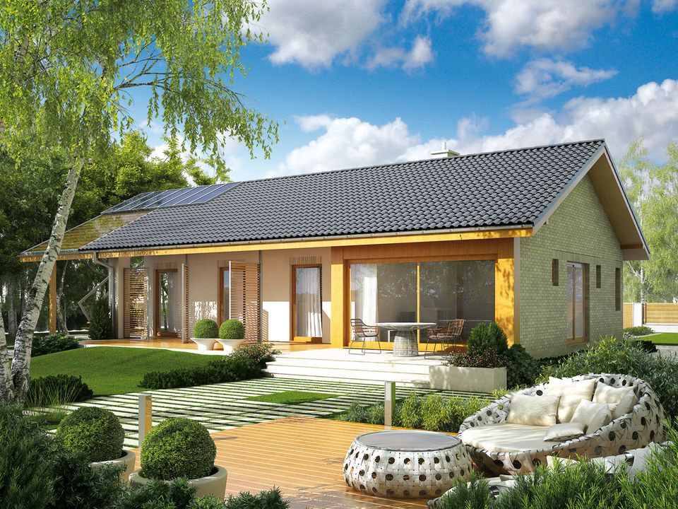 Ściany zewnętrzne: murowane, dwuwarstwowe, beton komórkowy 24 cm, ocieplenie wełna mineralna 12 cm. Ściany wewnętrzne: nośne i działowe murowane, cegła wapienno-piaskowa 24 cm i 12 cm. Strop: gęstożebrowy Teriva, ocieplenie wełna mineralna Isover 30 cm. Dach: konstrukcja drewniana, dachówka cementowa lub ceramiczna; więźba dachowa dostępna również w systemie prefabrykacji drewnianej. Ogrzewanie: kocioł gazowy kondensacyjny firmy Viessmann, rozprowadzenie ciepła: grzejniki firmy Purmo. Wentylacja: grawitacyjna. OZE: kolektory słoneczne firmy Viessmann. Dodatkowo: stacja uzdatniania wody firmy Viessmann. Elewacje: tynk cienkowarstwowy mineralny, okładzina drewniana i klinkierowa. Stolarka: drewniana, PVC lub aluminiowa, drzwi wejściowe firmy Hörmann, rolety zewnętrzne w systemie CleverBox firmy BeClever. Otoczenie: płyty tarasowe firmy Libet, system tarasowy ProDeck - deska kompozytowa Terra w kolorze orzech.