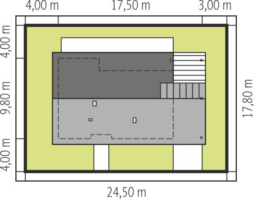 Graficzne opracowanie rzutów poglądowych widocznych na karcie projektu zostało wykonane przez Extradom.pl. Prezentowane przez Extradom.pl wizualizacje wykonane zostały przez autora projektu i należy poczytywać je jedynie za przykład i propozycję wykończenia, wizję architektoniczną autora projektu. Ostateczne wykończenie budynku może nastąpić na wiele sposobów. Szczegółowe rozwiązania zastosowane w oferowanej dokumentacji - w tym również ilość, lokalizacje i wygląd okien, drzwi, kominów - mogą w niewielkim stopniu różnić się od prezentowanej wizualizacji budynku.