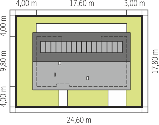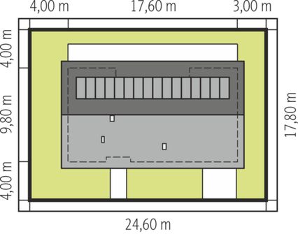 Graficzne opracowanie rzutów poglądowych widocznych na karcie projektu zostało wykonane przez Extradom.pl. Prezentowane przez Extradom.pl wizualizacje wykonane zostały przez autora projektu i należy poczytywać je jedynie za przykład i propozycję wykończenia, wizję architektoniczną autora projektu. Ostateczne wykończenie budynku może nastąpić na wiele sposobów. Szczegółowe rozwiązania zastosowane w oferowanej dokumentacji - w tym również ilość, lokalizacje i wygląd okien, drzwi, kominów - mogą w niewielkim stopniu różnić się od prezentowanej wizualizacji budynku.