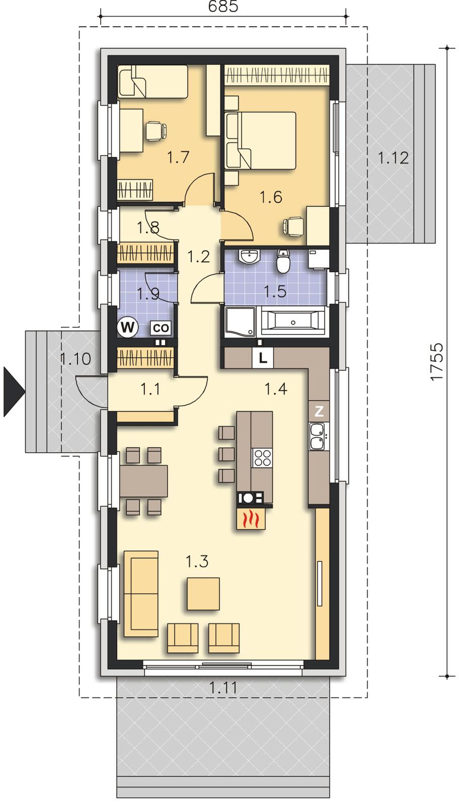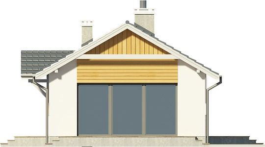 Graficzne opracowanie rzutów poglądowych widocznych na karcie projektu zostało wykonane przez Extradom.pl. Prezentowane przez Extradom.pl wizualizacje wykonane zostały przez autora projektu i należy poczytywać je jedynie za przykład i propozycję wykończenia, wizję architektoniczną autora projektu. Ostateczne wykończenie budynku może nastąpić na wiele sposobów. Szczegółowe rozwiązania zastosowane w oferowanej dokumentacji - w tym również ilość, lokalizacje i wygląd okien, drzwi, kominów - mogą w niewielkim stopniu różnić się od prezentowanej wizualizacji budynku.