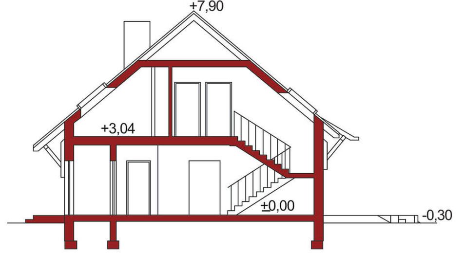 Ściany: bloczek z betonu komórkowego 24 cm, styropian Termo Organika 20 cm, tynk. Strop: Teriva 1. Dach: dwuspadowy, nachylenie 40 st., więźba drewniana, dachówka ceramiczna. Ocieplenie dachu: wełna mineralna ISOVER Uni Mata. Ogrzewanie: gazowe, paliwo stałe ( płatny dodatek). Okna dachowe: VELUX.