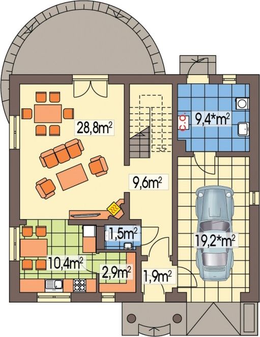 Graficzne opracowanie rzutów poglądowych widocznych na karcie projektu zostało wykonane przez Extradom.pl. Prezentowane przez Extradom.pl wizualizacje wykonane zostały przez autora projektu i należy poczytywać je jedynie za przykład i propozycję wykończenia, wizję architektoniczną autora projektu. Ostateczne wykończenie budynku może nastąpić na wiele sposobów. Szczegółowe rozwiązania zastosowane w oferowanej dokumentacji - w tym również ilość, lokalizacje i wygląd okien, drzwi, kominów - mogą w niewielkim stopniu różnić się od prezentowanej wizualizacji budynku.