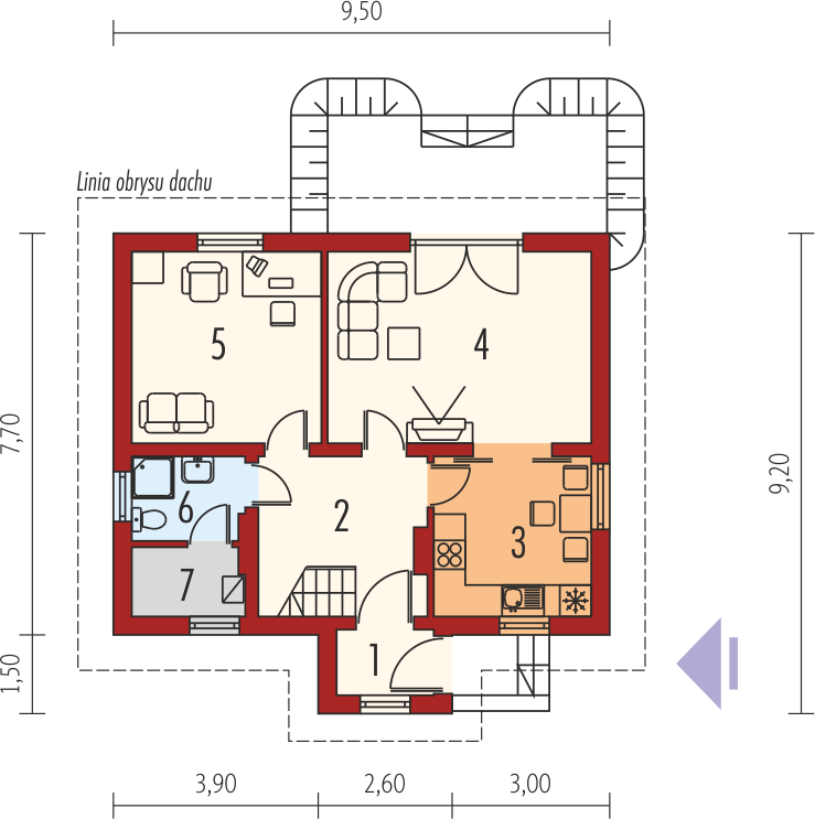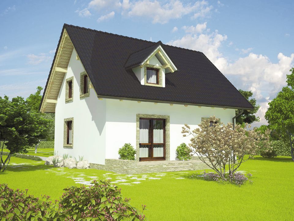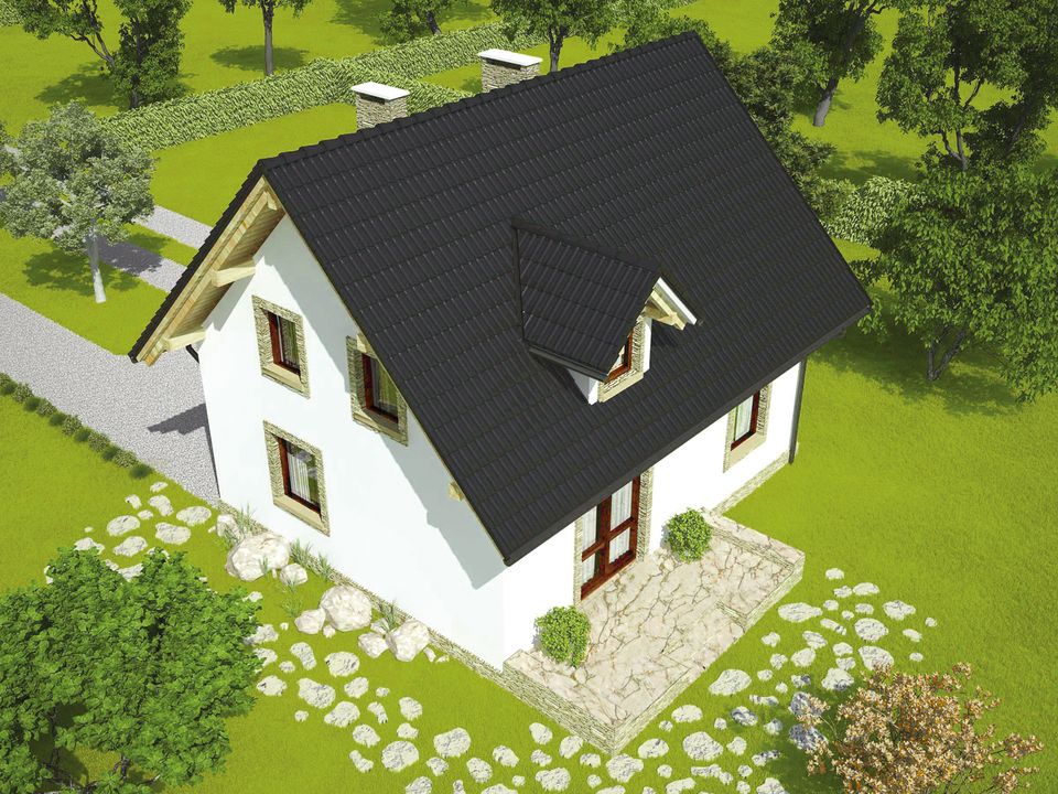 Graficzne opracowanie rzutów poglądowych widocznych na karcie projektu zostało wykonane przez Extradom.pl. Prezentowane przez Extradom.pl wizualizacje wykonane zostały przez autora projektu i należy poczytywać je jedynie za przykład i propozycję wykończenia, wizję architektoniczną autora projektu. Ostateczne wykończenie budynku może nastąpić na wiele sposobów. Szczegółowe rozwiązania zastosowane w oferowanej dokumentacji - w tym również ilość, lokalizacje i wygląd okien, drzwi, kominów - mogą w niewielkim stopniu różnić się od prezentowanej wizualizacji budynku.