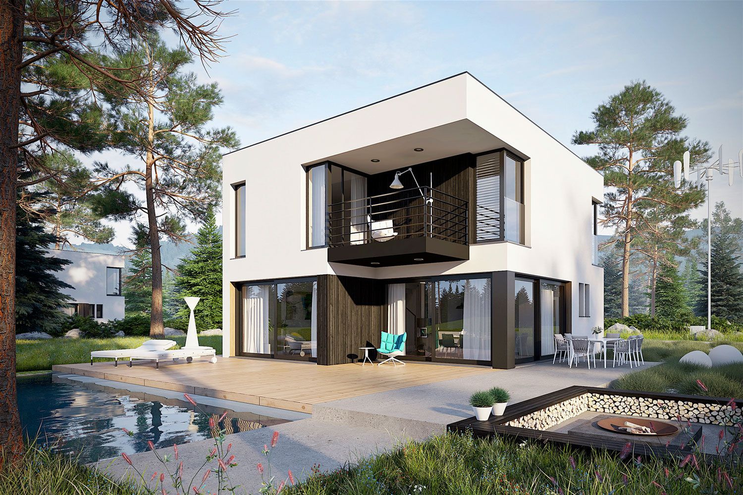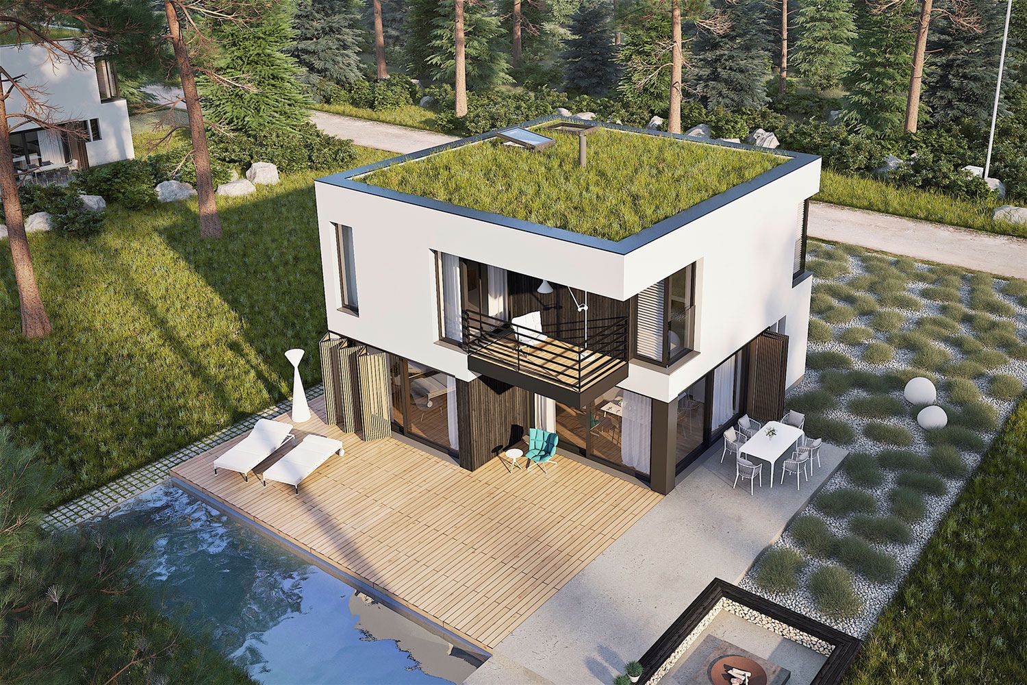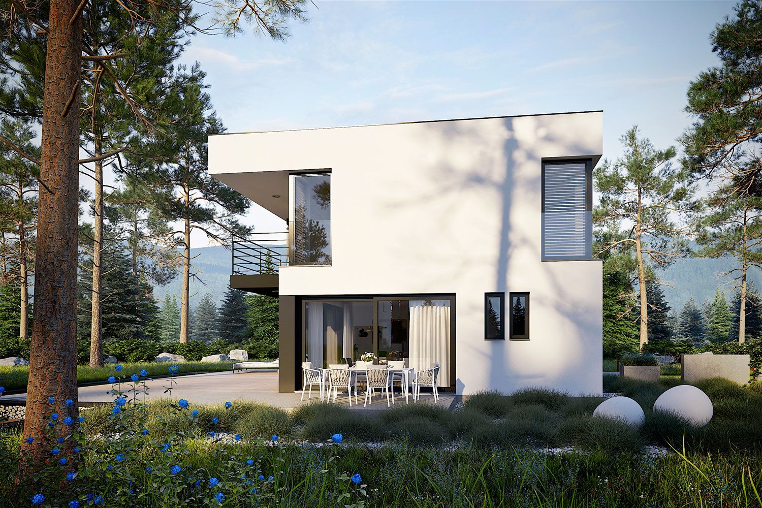 Bryła budynku jest zwarta i nowoczesna, oparta na planie prostokąta i zwieńczona płaskim dachem, co podkreśla jej minimalistyczny charakter. Duże przeszklenia naturalnie doświetlają wnętrza i otwierają dom na otoczenie. Dodatkową przestrzeń do wypoczynku na świeżym powietrzu tworzą taras na parterze oraz balkon dostępny z piętra.