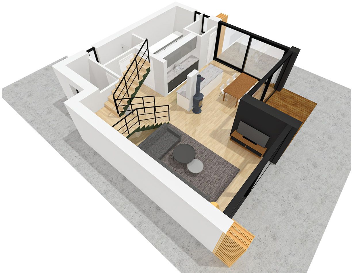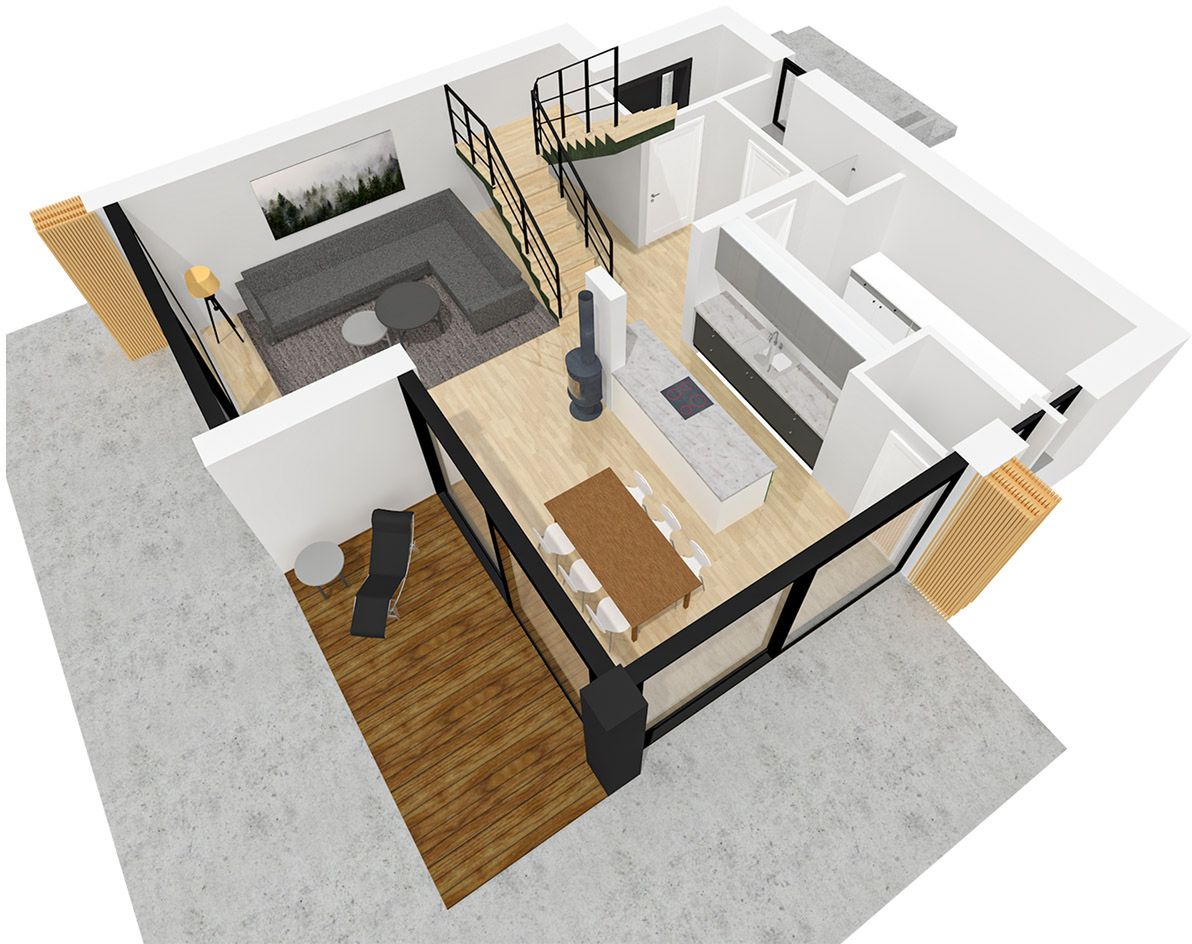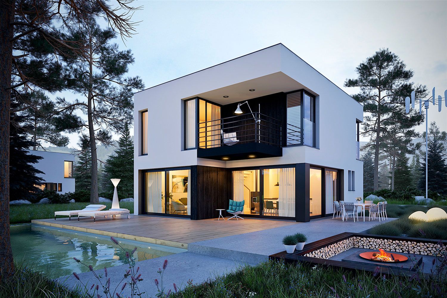 Bryła budynku jest zwarta i nowoczesna, oparta na planie prostokąta i zwieńczona płaskim dachem, co podkreśla jej minimalistyczny charakter. Duże przeszklenia naturalnie doświetlają wnętrza i otwierają dom na otoczenie. Dodatkową przestrzeń do wypoczynku na świeżym powietrzu tworzą taras na parterze oraz balkon dostępny z piętra.