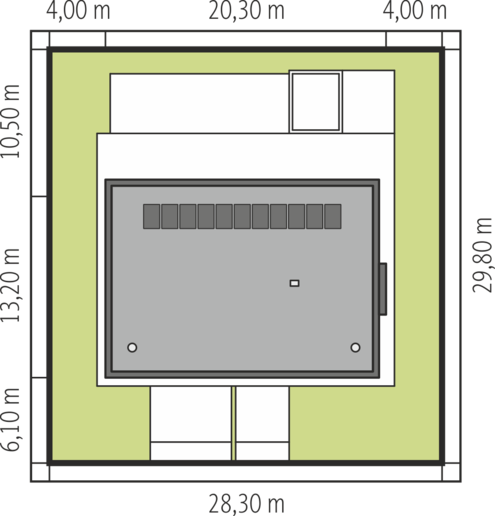 Ściany zewnętrzne: murowane, dwuwarstwowe, docieplenie grubości 25 cm. Strop: gęstożebrowy. Dach: w technologii stropodachu odwróconego W projekcie zastosowano rozwiązania technologiczne grupy Saint-Gobain. Ogrzewanie: kocioł gazowy, rozprowadzenie ciepła: grzejniki. Wentylacja: grawitacyjna. Elewacje: tynk cienkowarstwowy mineralny, okładzina z płyty HPL z naturalną okleiną drewnianą firmy Prodema. Stolarka: drewniana, PVC lub aluminiowa, świetliki tunelowe firmy Velux. Otoczenie: system tarasowy ProDeck - deska kompozytowa Terra w kolorze złoty dąb.