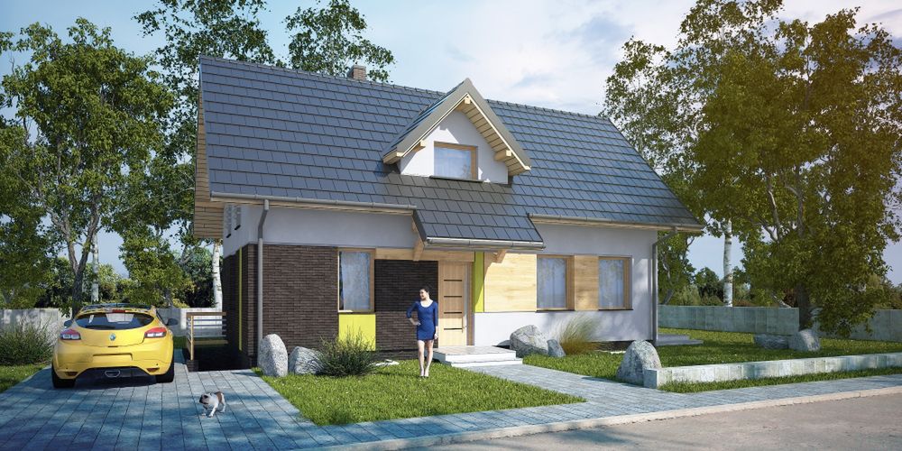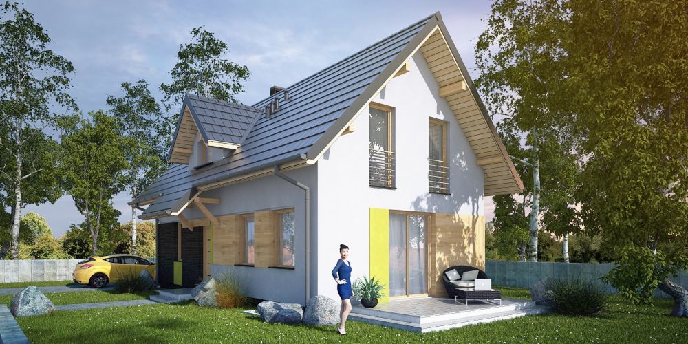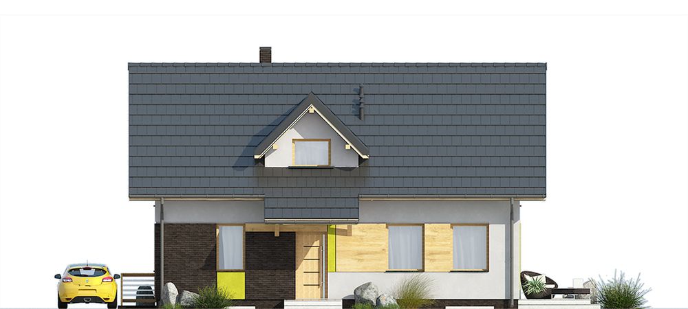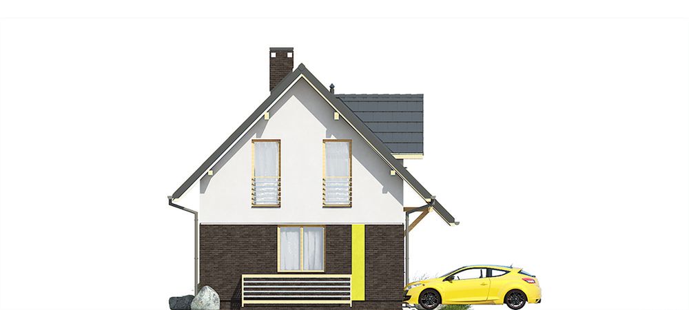 Graficzne opracowanie rzutów poglądowych widocznych na karcie projektu zostało wykonane przez Extradom.pl. Prezentowane przez Extradom.pl wizualizacje wykonane zostały przez autora projektu i należy poczytywać je jedynie za przykład i propozycję wykończenia, wizję architektoniczną autora projektu. Ostateczne wykończenie budynku może nastąpić na wiele sposobów. Szczegółowe rozwiązania zastosowane w oferowanej dokumentacji - w tym również ilość, lokalizacje i wygląd okien, drzwi, kominów - mogą w niewielkim stopniu różnić się od prezentowanej wizualizacji budynku.