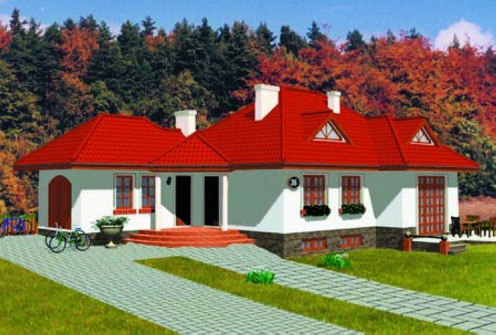 Ściany zewnętrzne: pustaki ceramiczne, styropian, tynk. Ściany wewnętrzne: pustaki ceramiczne, tynk. Strop: żelbetowy. Więźba dachowa: drewniana. Pokrycie dachu: dachówka ceramiczna lub blachodachówka.