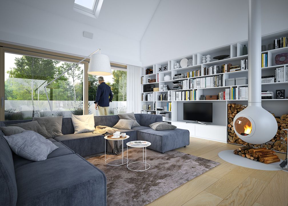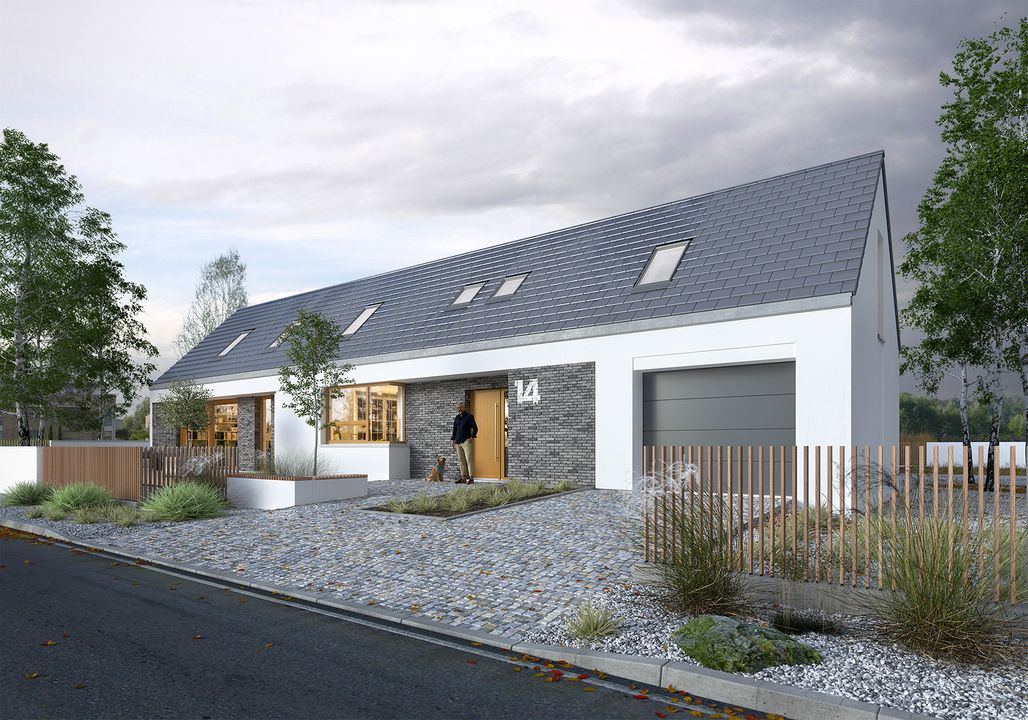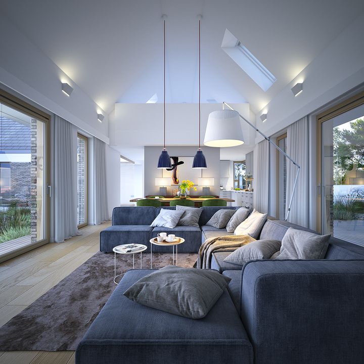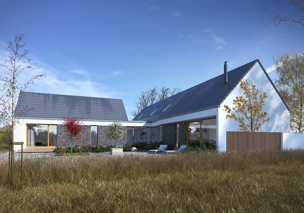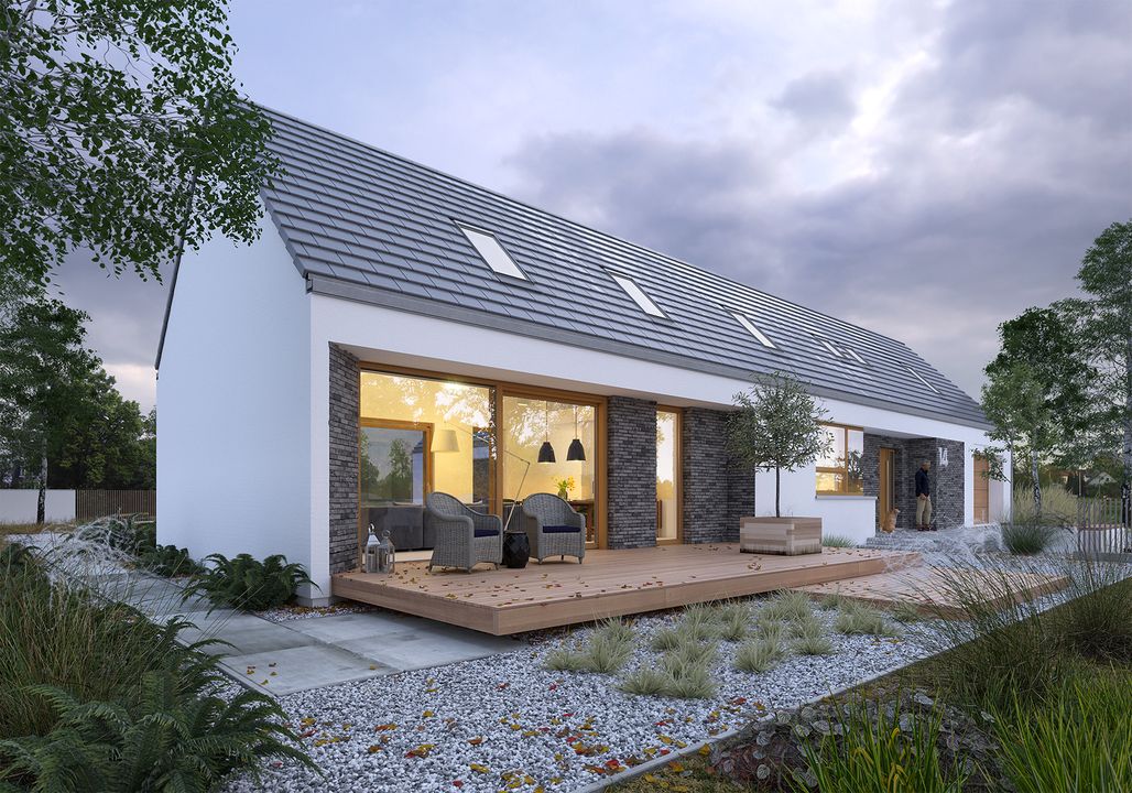 Graficzne opracowanie rzutów poglądowych widocznych na karcie projektu zostało wykonane przez Extradom.pl. Prezentowane przez Extradom.pl wizualizacje wykonane zostały przez autora projektu i należy poczytywać je jedynie za przykład i propozycję wykończenia, wizję architektoniczną autora projektu. Ostateczne wykończenie budynku może nastąpić na wiele sposobów. Szczegółowe rozwiązania zastosowane w oferowanej dokumentacji - w tym również ilość, lokalizacje i wygląd okien, drzwi, kominów - mogą w niewielkim stopniu różnić się od prezentowanej wizualizacji budynku.