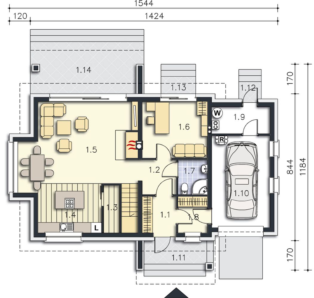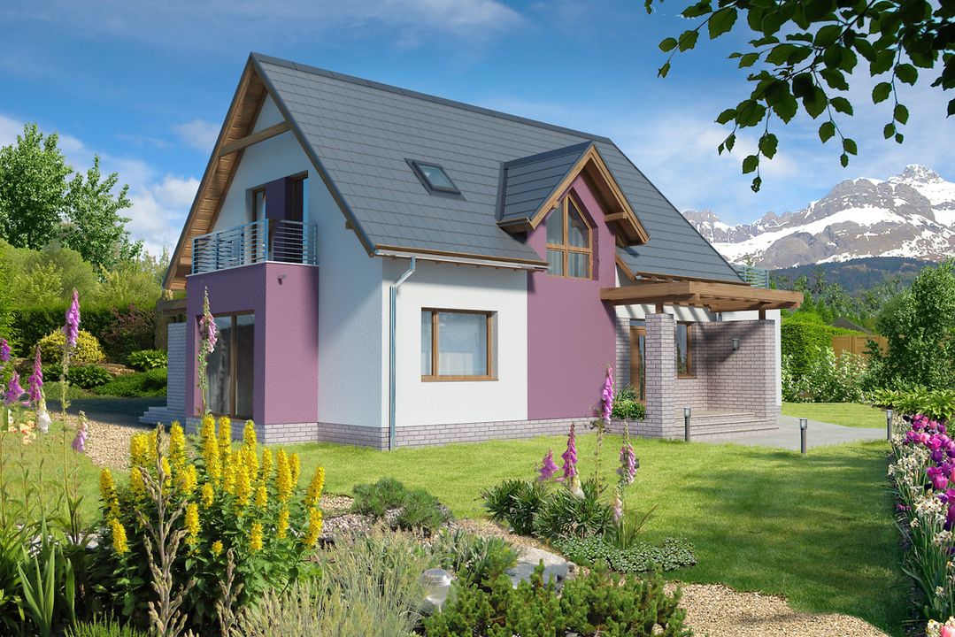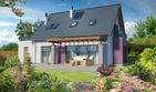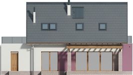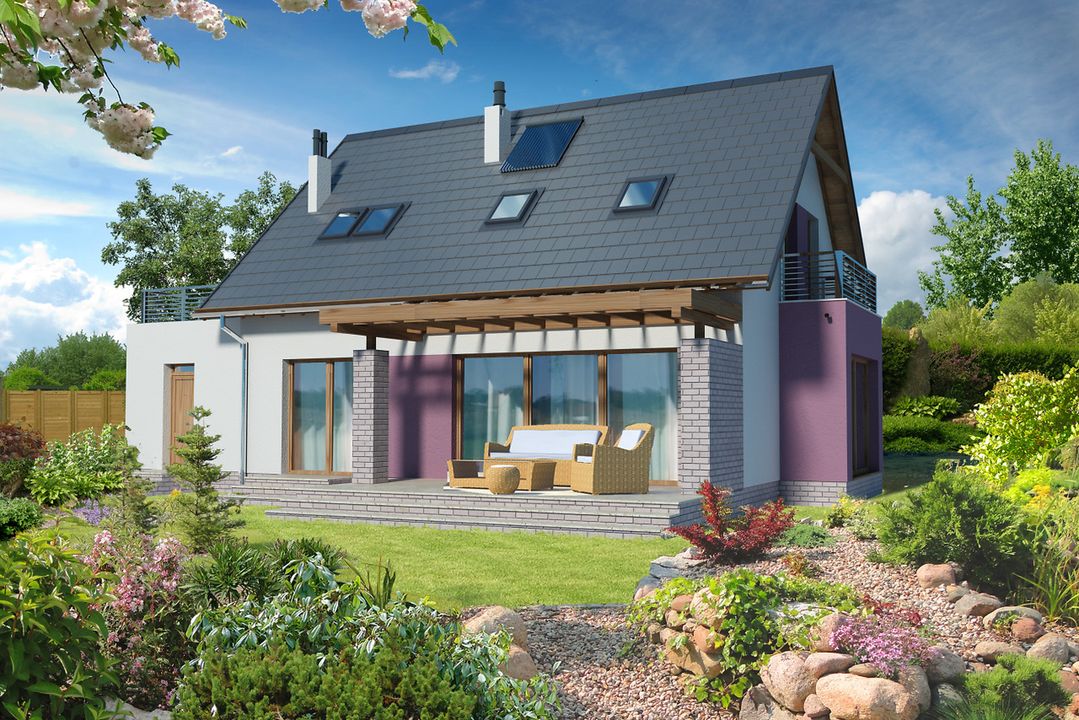 Graficzne opracowanie rzutów poglądowych widocznych na karcie projektu zostało wykonane przez Extradom.pl. Prezentowane przez Extradom.pl wizualizacje wykonane zostały przez autora projektu i należy poczytywać je jedynie za przykład i propozycję wykończenia, wizję architektoniczną autora projektu. Ostateczne wykończenie budynku może nastąpić na wiele sposobów. Szczegółowe rozwiązania zastosowane w oferowanej dokumentacji - w tym również ilość, lokalizacje i wygląd okien, drzwi, kominów - mogą w niewielkim stopniu różnić się od prezentowanej wizualizacji budynku.