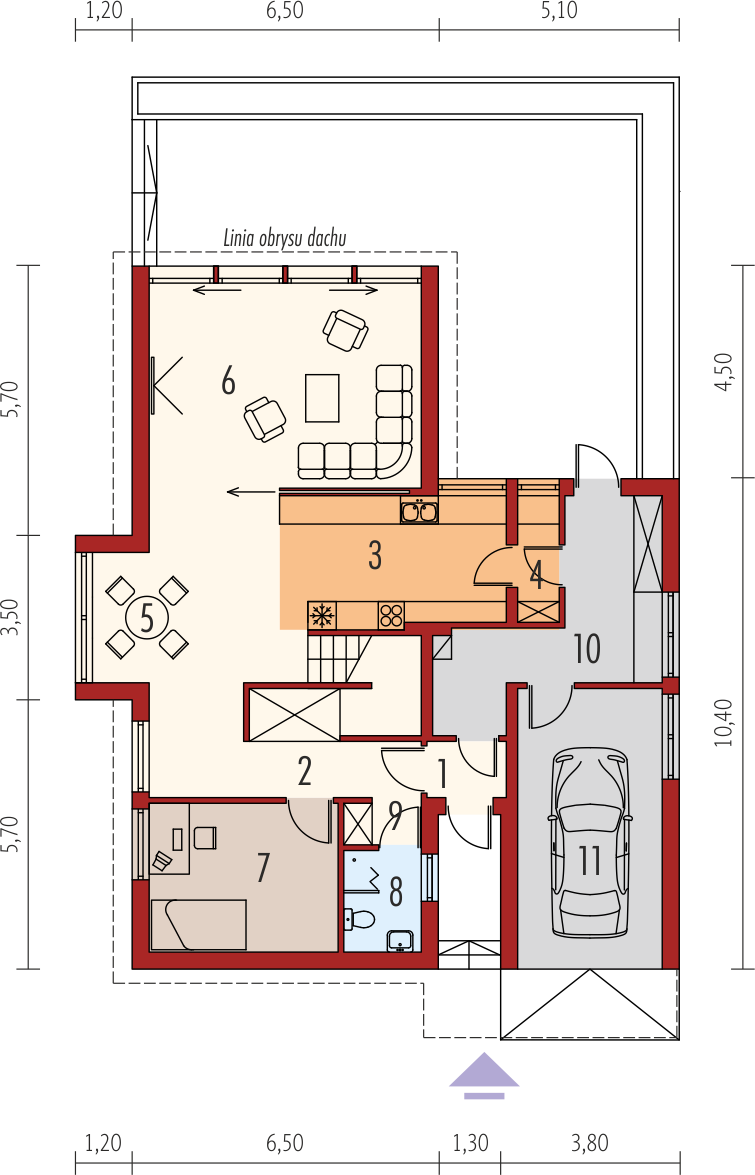 Graficzne opracowanie rzutów poglądowych widocznych na karcie projektu zostało wykonane przez Extradom.pl. Prezentowane przez Extradom.pl wizualizacje wykonane zostały przez autora projektu i należy poczytywać je jedynie za przykład i propozycję wykończenia, wizję architektoniczną autora projektu. Ostateczne wykończenie budynku może nastąpić na wiele sposobów. Szczegółowe rozwiązania zastosowane w oferowanej dokumentacji - w tym również ilość, lokalizacje i wygląd okien, drzwi, kominów - mogą w niewielkim stopniu różnić się od prezentowanej wizualizacji budynku.