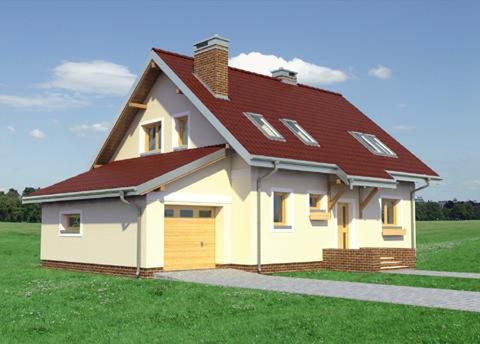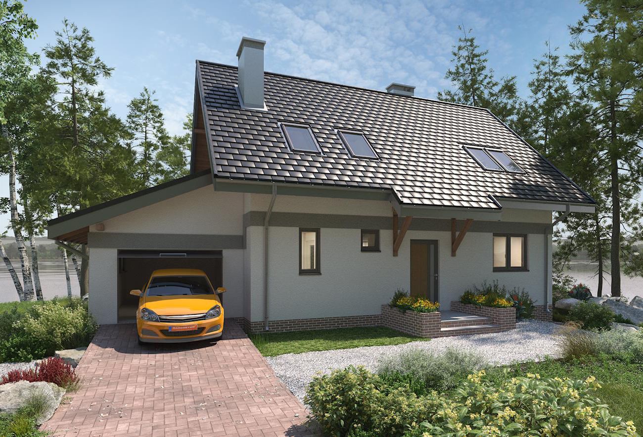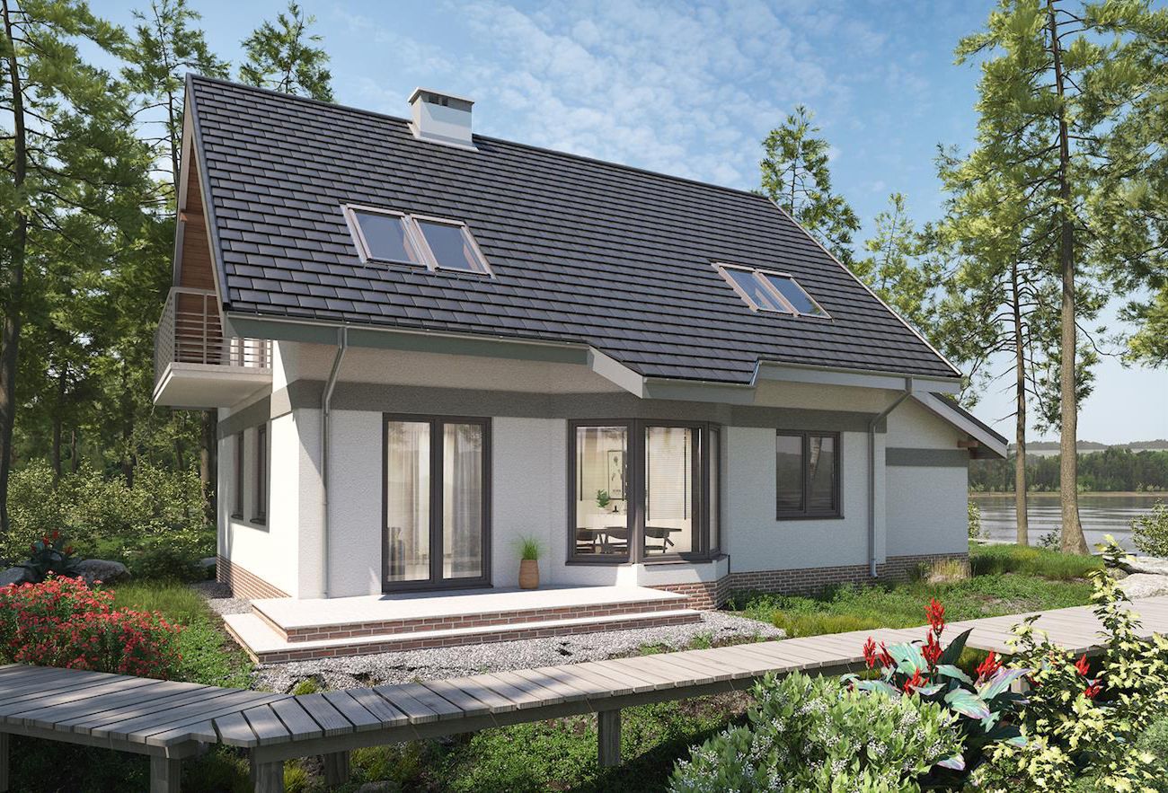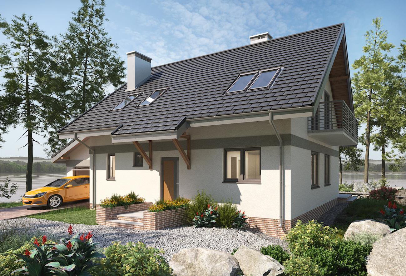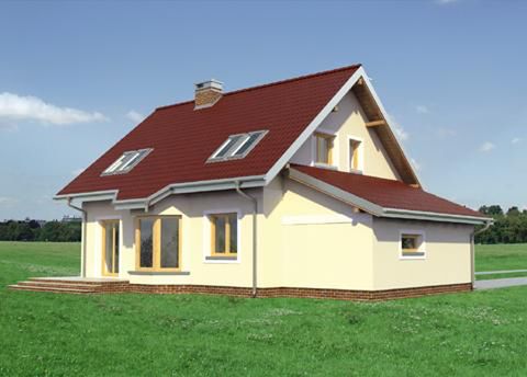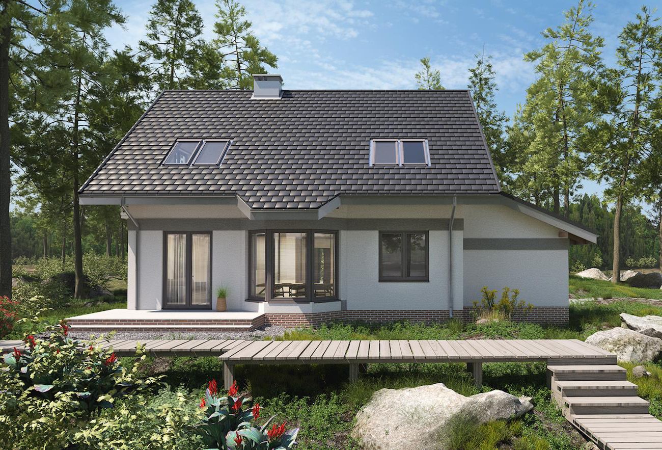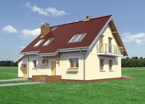 Graficzne opracowanie rzutów poglądowych widocznych na karcie projektu zostało wykonane przez Extradom.pl. Prezentowane przez Extradom.pl wizualizacje wykonane zostały przez autora projektu i należy poczytywać je jedynie za przykład i propozycję wykończenia, wizję architektoniczną autora projektu. Ostateczne wykończenie budynku może nastąpić na wiele sposobów. Szczegółowe rozwiązania zastosowane w oferowanej dokumentacji - w tym również ilość, lokalizacje i wygląd okien, drzwi, kominów - mogą w niewielkim stopniu różnić się od prezentowanej wizualizacji budynku.