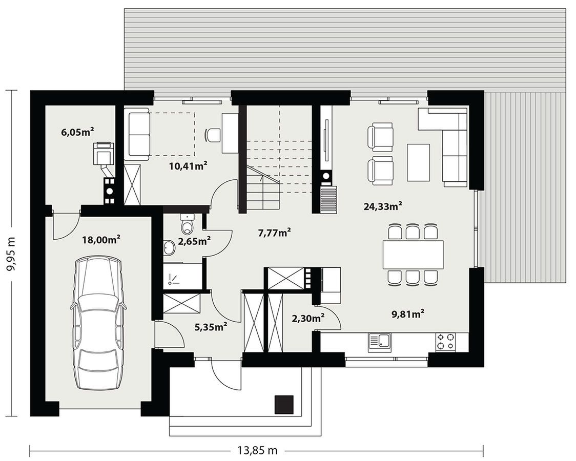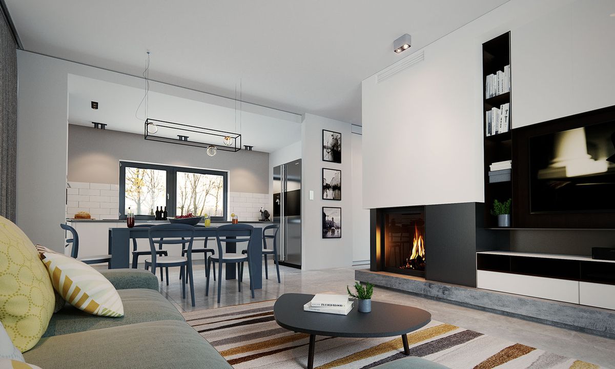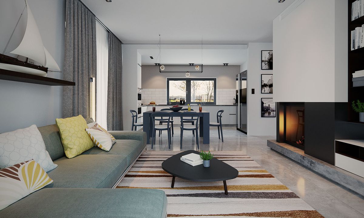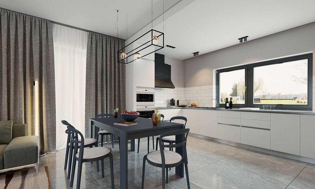 Graficzne opracowanie rzutów poglądowych widocznych na karcie projektu zostało wykonane przez Extradom.pl. Prezentowane przez Extradom.pl wizualizacje wykonane zostały przez autora projektu i należy poczytywać je jedynie za przykład i propozycję wykończenia, wizję architektoniczną autora projektu. Ostateczne wykończenie budynku może nastąpić na wiele sposobów. Szczegółowe rozwiązania zastosowane w oferowanej dokumentacji - w tym również ilość, lokalizacje i wygląd okien, drzwi, kominów - mogą w niewielkim stopniu różnić się od prezentowanej wizualizacji budynku.