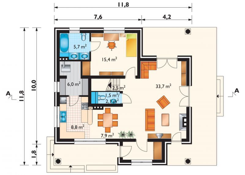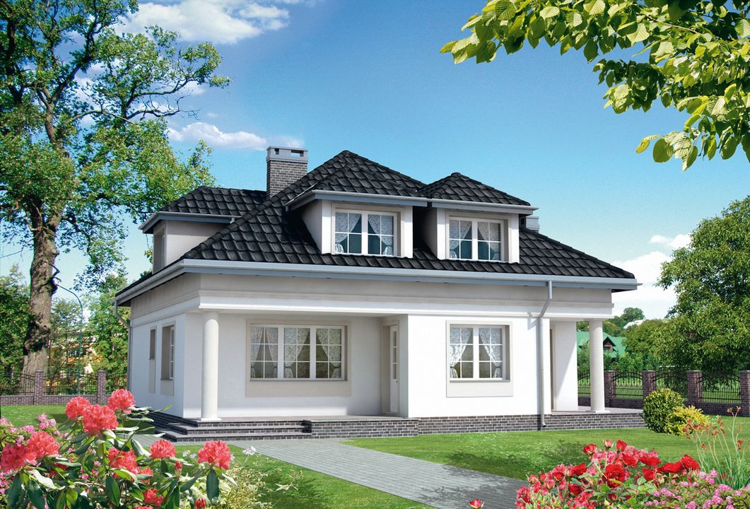 Graficzne opracowanie rzutów poglądowych widocznych na karcie projektu zostało wykonane przez Extradom.pl. Prezentowane przez Extradom.pl wizualizacje wykonane zostały przez autora projektu i należy poczytywać je jedynie za przykład i propozycję wykończenia, wizję architektoniczną autora projektu. Ostateczne wykończenie budynku może nastąpić na wiele sposobów. Szczegółowe rozwiązania zastosowane w oferowanej dokumentacji - w tym również ilość, lokalizacje i wygląd okien, drzwi, kominów - mogą w niewielkim stopniu różnić się od prezentowanej wizualizacji budynku.