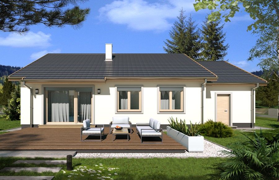 Graficzne opracowanie rzutów poglądowych widocznych na karcie projektu zostało wykonane przez Extradom.pl. Prezentowane przez Extradom.pl wizualizacje wykonane zostały przez autora projektu i należy poczytywać je jedynie za przykład i propozycję wykończenia, wizję architektoniczną autora projektu. Ostateczne wykończenie budynku może nastąpić na wiele sposobów. Szczegółowe rozwiązania zastosowane w oferowanej dokumentacji - w tym również ilość, lokalizacje i wygląd okien, drzwi, kominów - mogą w niewielkim stopniu różnić się od prezentowanej wizualizacji budynku.