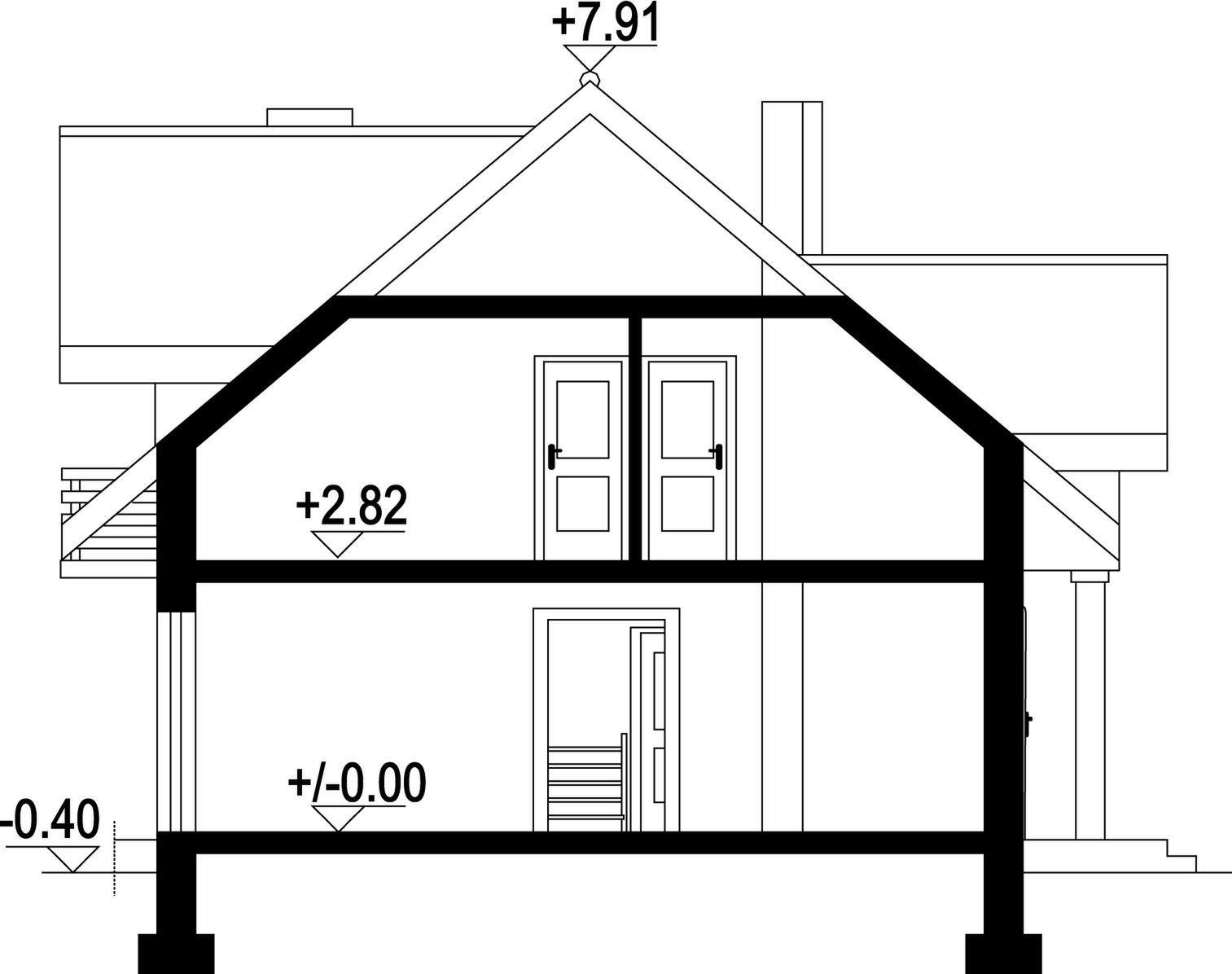 Wys. ścianki kolankowej 0.92 m Ilość drewna na więźbę 9.5 m³. Strop: płyta żelbetowa. Pokrycie dachu: dachówka ceramiczna. Ściany wewnętrzne: pustaki ceramiczne. Ściany zewnętrzne: pustaki ceramiczne + styropian. Typ ogrzewania: kocioł gazowy lub kocioł na paliwo stałe.