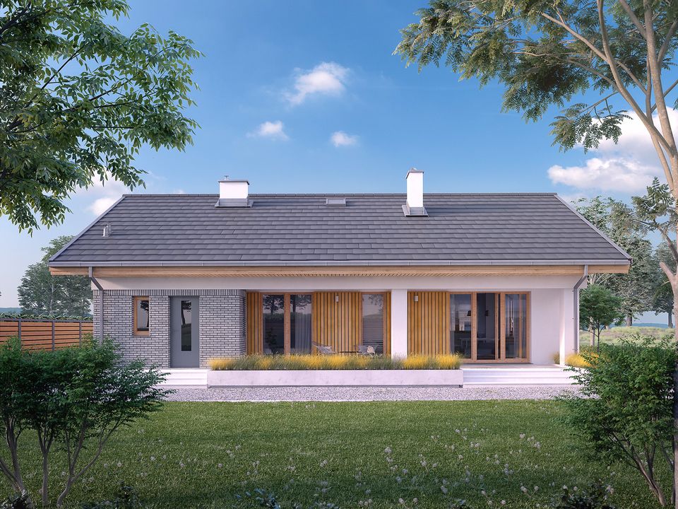 Graficzne opracowanie rzutów poglądowych widocznych na karcie projektu zostało wykonane przez Extradom.pl. Prezentowane przez Extradom.pl wizualizacje wykonane zostały przez autora projektu i należy poczytywać je jedynie za przykład i propozycję wykończenia, wizję architektoniczną autora projektu. Ostateczne wykończenie budynku może nastąpić na wiele sposobów. Szczegółowe rozwiązania zastosowane w oferowanej dokumentacji - w tym również ilość, lokalizacje i wygląd okien, drzwi, kominów - mogą w niewielkim stopniu różnić się od prezentowanej wizualizacji budynku.