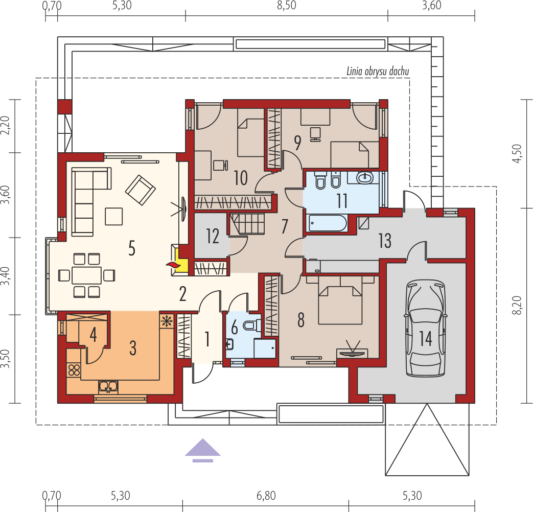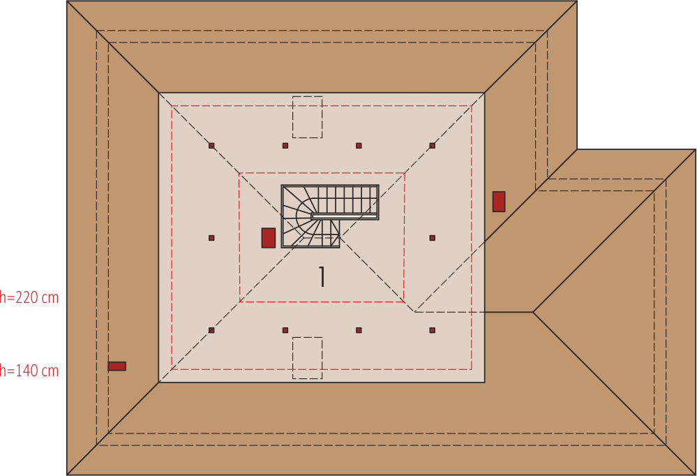 Graficzne opracowanie rzutów poglądowych widocznych na karcie projektu zostało wykonane przez Extradom.pl. Prezentowane przez Extradom.pl wizualizacje wykonane zostały przez autora projektu i należy poczytywać je jedynie za przykład i propozycję wykończenia, wizję architektoniczną autora projektu. Ostateczne wykończenie budynku może nastąpić na wiele sposobów. Szczegółowe rozwiązania zastosowane w oferowanej dokumentacji - w tym również ilość, lokalizacje i wygląd okien, drzwi, kominów - mogą w niewielkim stopniu różnić się od prezentowanej wizualizacji budynku.