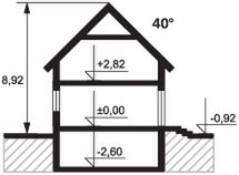 Dach: dachówka, kąt nachylenia 40°. Stropy: żelbetowe, wylewane. Ściany: 2-warstwowe - pustak ceramiczny + styropian. Ogrzewanie: gazowe, olejowe.