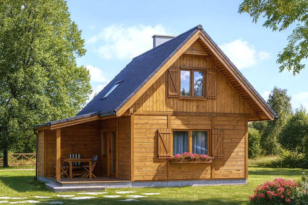 Fundamenty: betonowe ławy i ściany fundamentowe z bloczków betonowych. Ściany zewnętrzne: konstrukcja szkieletowa + tynk cienkowarstwowy na OSB lub inne technologie. Strop: belkowy + podsufitka + posadzka na płycie OSB lub inne technologie. Pokrycie dachu: dachówka lub blacha dachówkowa. Nachylenie dachu: 45 stopni.