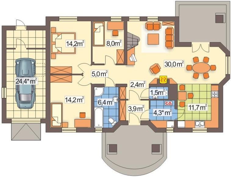 Graficzne opracowanie rzutów poglądowych widocznych na karcie projektu zostało wykonane przez Extradom.pl. Prezentowane przez Extradom.pl wizualizacje wykonane zostały przez autora projektu i należy poczytywać je jedynie za przykład i propozycję wykończenia, wizję architektoniczną autora projektu. Ostateczne wykończenie budynku może nastąpić na wiele sposobów. Szczegółowe rozwiązania zastosowane w oferowanej dokumentacji - w tym również ilość, lokalizacje i wygląd okien, drzwi, kominów - mogą w niewielkim stopniu różnić się od prezentowanej wizualizacji budynku.
