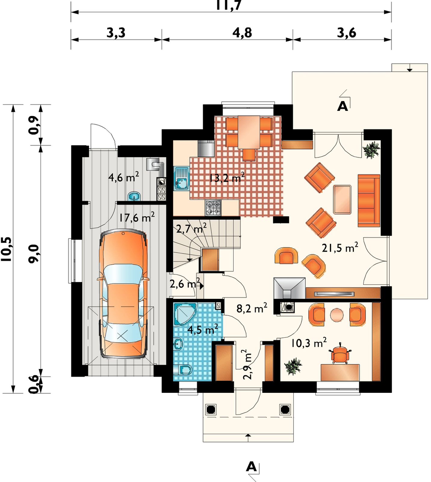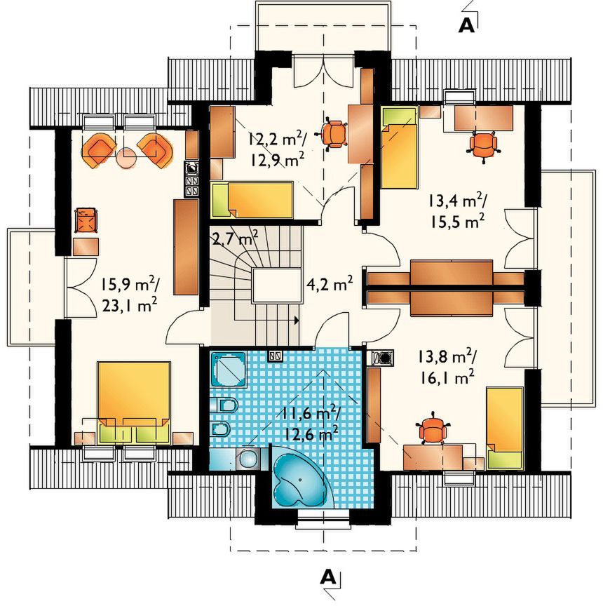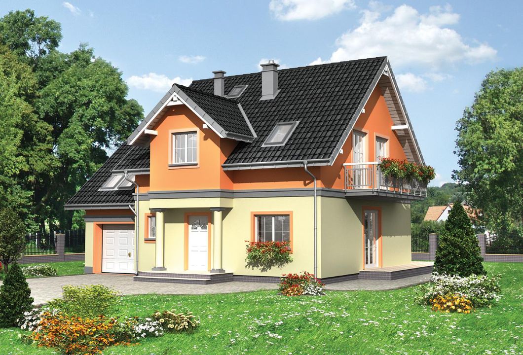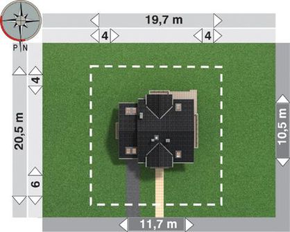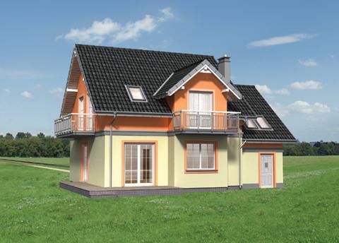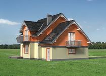 Graficzne opracowanie rzutów poglądowych widocznych na karcie projektu zostało wykonane przez Extradom.pl. Prezentowane przez Extradom.pl wizualizacje wykonane zostały przez autora projektu i należy poczytywać je jedynie za przykład i propozycję wykończenia, wizję architektoniczną autora projektu. Ostateczne wykończenie budynku może nastąpić na wiele sposobów. Szczegółowe rozwiązania zastosowane w oferowanej dokumentacji - w tym również ilość, lokalizacje i wygląd okien, drzwi, kominów - mogą w niewielkim stopniu różnić się od prezentowanej wizualizacji budynku.