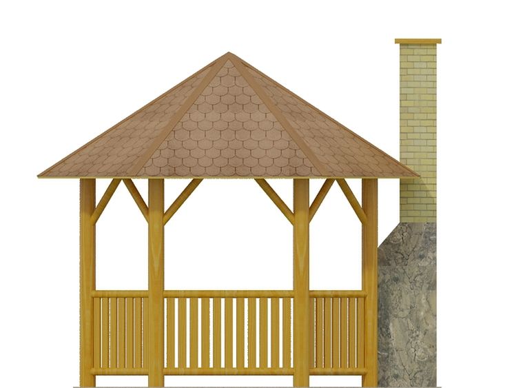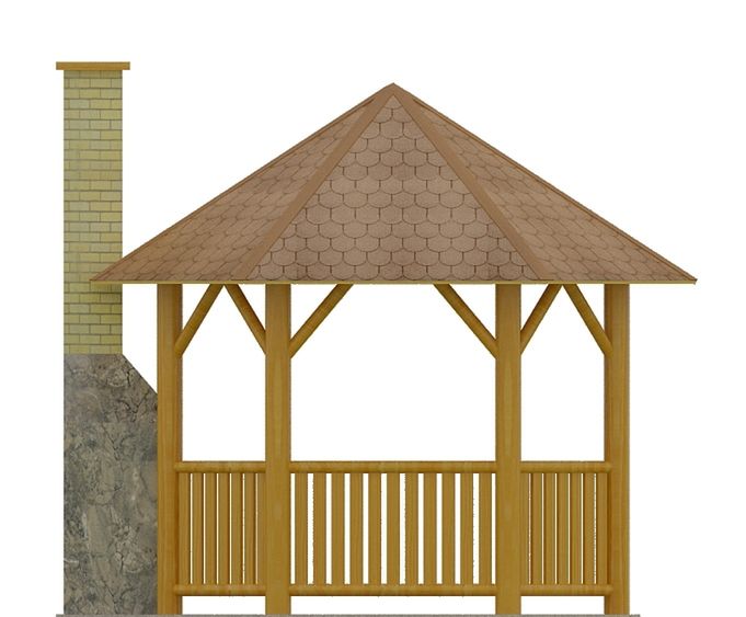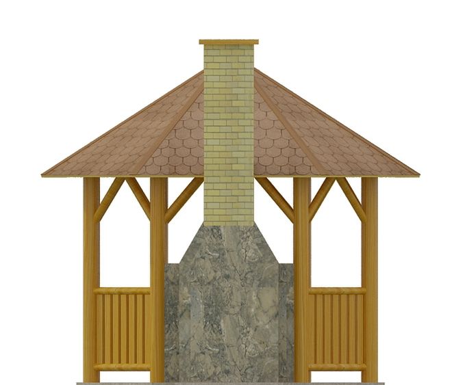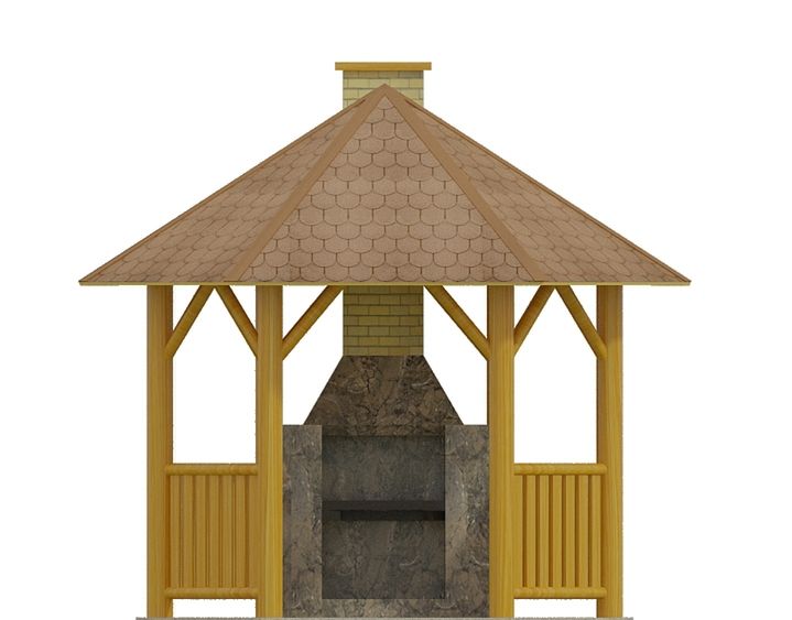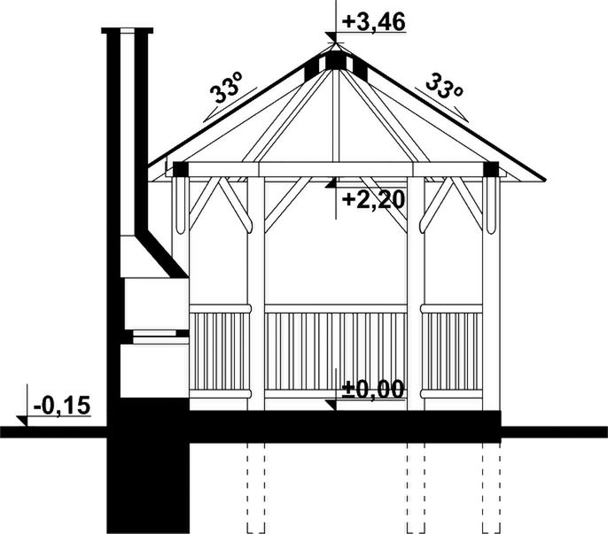 Budynek konstrukcji drewnianej. Grill z cegły ceramicznej pełnej. Więźba dachowa wielospadowa, drewniana, pokryta gontem bitumicznym.