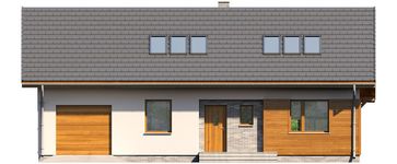 Graficzne opracowanie rzutów poglądowych widocznych na karcie projektu zostało wykonane przez Extradom.pl. Prezentowane przez Extradom.pl wizualizacje wykonane zostały przez autora projektu i należy poczytywać je jedynie za przykład i propozycję wykończenia, wizję architektoniczną autora projektu. Ostateczne wykończenie budynku może nastąpić na wiele sposobów. Szczegółowe rozwiązania zastosowane w oferowanej dokumentacji - w tym również ilość, lokalizacje i wygląd okien, drzwi, kominów - mogą w niewielkim stopniu różnić się od prezentowanej wizualizacji budynku.