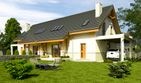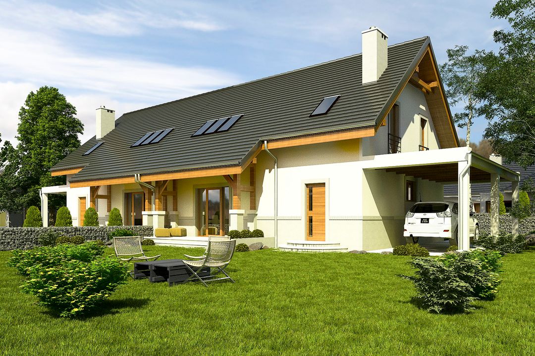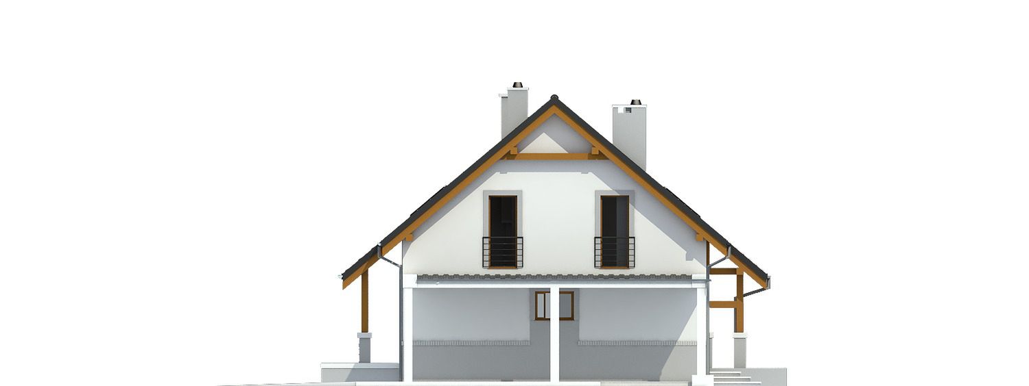 Graficzne opracowanie rzutów poglądowych widocznych na karcie projektu zostało wykonane przez Extradom.pl. Prezentowane przez Extradom.pl wizualizacje wykonane zostały przez autora projektu i należy poczytywać je jedynie za przykład i propozycję wykończenia, wizję architektoniczną autora projektu. Ostateczne wykończenie budynku może nastąpić na wiele sposobów. Szczegółowe rozwiązania zastosowane w oferowanej dokumentacji - w tym również ilość, lokalizacje i wygląd okien, drzwi, kominów - mogą w niewielkim stopniu różnić się od prezentowanej wizualizacji budynku.