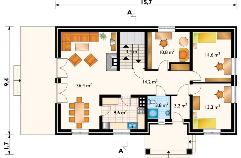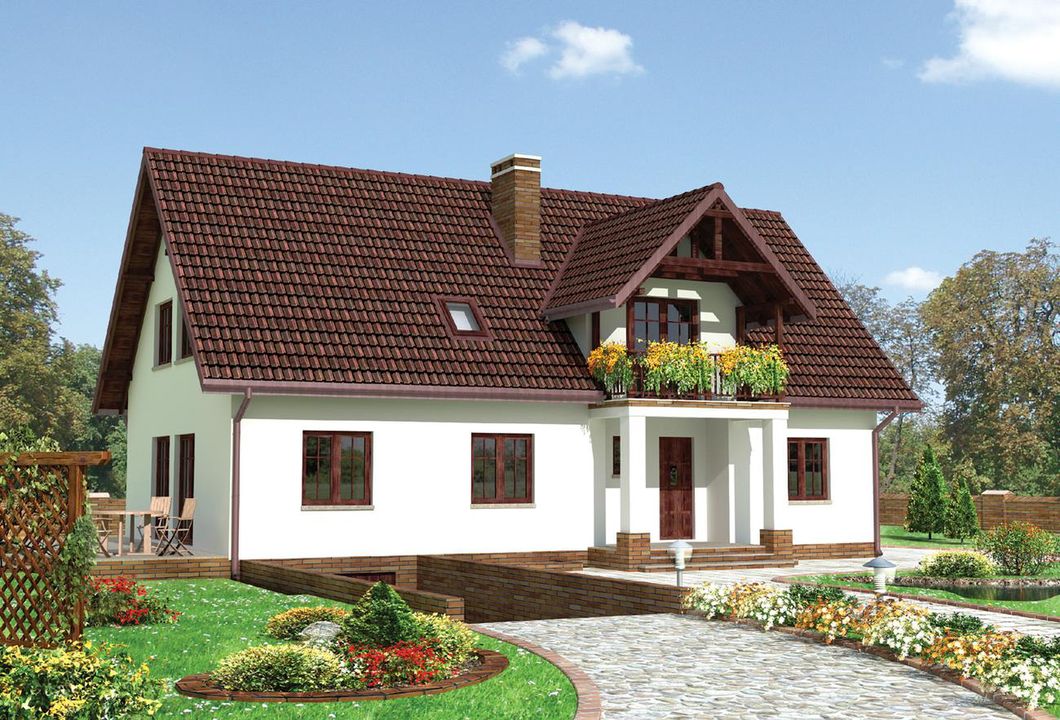 Graficzne opracowanie rzutów poglądowych widocznych na karcie projektu zostało wykonane przez Extradom.pl. Prezentowane przez Extradom.pl wizualizacje wykonane zostały przez autora projektu i należy poczytywać je jedynie za przykład i propozycję wykończenia, wizję architektoniczną autora projektu. Ostateczne wykończenie budynku może nastąpić na wiele sposobów. Szczegółowe rozwiązania zastosowane w oferowanej dokumentacji - w tym również ilość, lokalizacje i wygląd okien, drzwi, kominów - mogą w niewielkim stopniu różnić się od prezentowanej wizualizacji budynku.