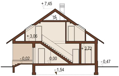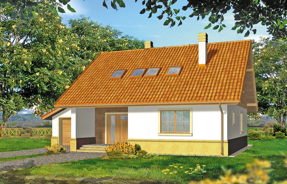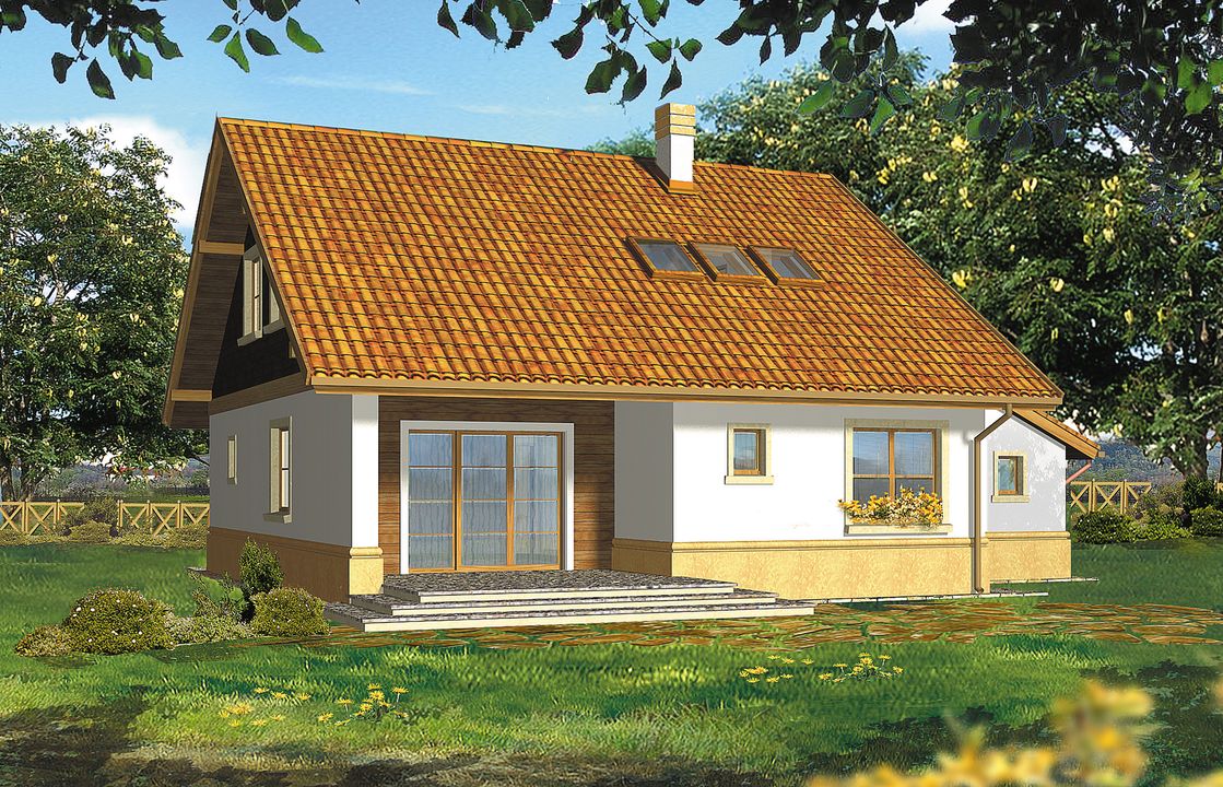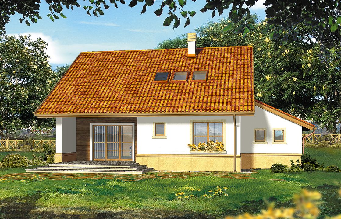 Konstrukcja ściany fundamentowe - bloczek betonowy; ściany zewnętrzne - beton komórkowy gr. 24cm+styropian Termo Organika Termonium Plus gr. 12cm lub 20cm; ściany wewnętrzne - bloczek silikatowy gr. 24cm; strop - Teriva; konstrukcja dachu - drewniana . Instalacje W projekcie przewidziano instalacjie: c.o. i c.w.u., grzejniki płytowe, instalacje wodno-kanalizacyjna oraz elektryczne, wentylacja grawitacyjna. Wykończenie pokrycie dachowe - dachówka cementowa (w ramach adaptacji inny materiał); ścianki działowe na parterze - bloczki silikatowe; na poddaszu z płyt gipsowo-kartonowych; schody drewniane - jednobiegowe, okna - PVC, okna dachowe i wyłaz dachowy - Fakro Okres oczekiwania: 2 tygodnie od daty zamówienia.