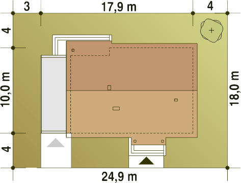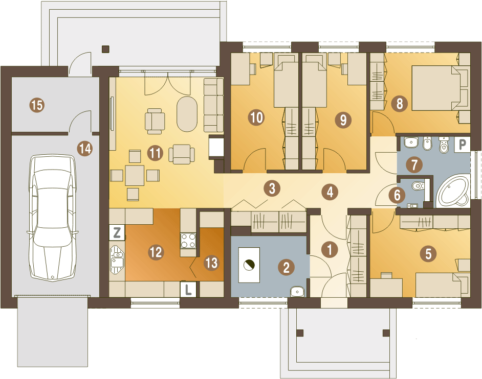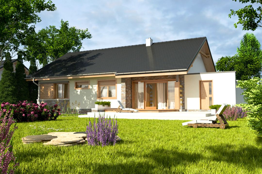 Graficzne opracowanie rzutów poglądowych widocznych na karcie projektu zostało wykonane przez Extradom.pl. Prezentowane przez Extradom.pl wizualizacje wykonane zostały przez autora projektu i należy poczytywać je jedynie za przykład i propozycję wykończenia, wizję architektoniczną autora projektu. Ostateczne wykończenie budynku może nastąpić na wiele sposobów. Szczegółowe rozwiązania zastosowane w oferowanej dokumentacji - w tym również ilość, lokalizacje i wygląd okien, drzwi, kominów - mogą w niewielkim stopniu różnić się od prezentowanej wizualizacji budynku.