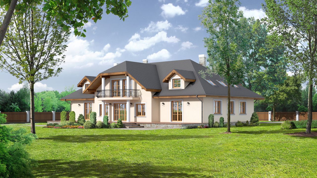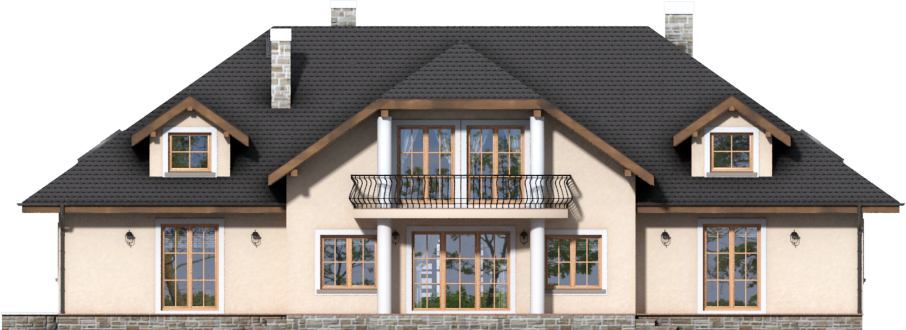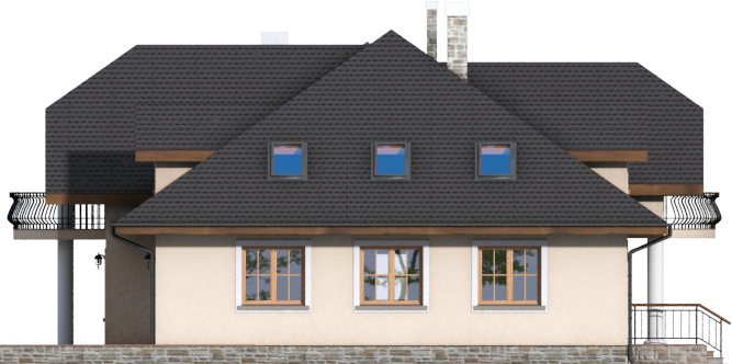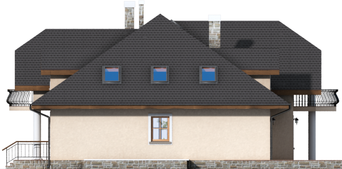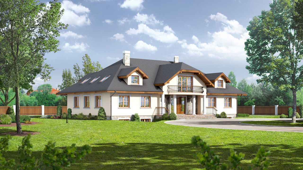 Graficzne opracowanie rzutów poglądowych widocznych na karcie projektu zostało wykonane przez Extradom.pl. Prezentowane przez Extradom.pl wizualizacje wykonane zostały przez autora projektu i należy poczytywać je jedynie za przykład i propozycję wykończenia, wizję architektoniczną autora projektu. Ostateczne wykończenie budynku może nastąpić na wiele sposobów. Szczegółowe rozwiązania zastosowane w oferowanej dokumentacji - w tym również ilość, lokalizacje i wygląd okien, drzwi, kominów - mogą w niewielkim stopniu różnić się od prezentowanej wizualizacji budynku.