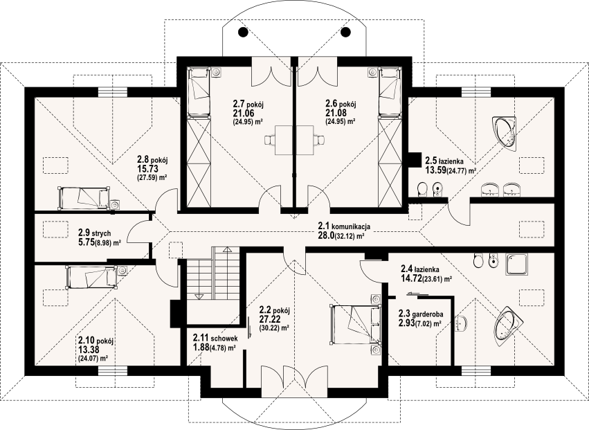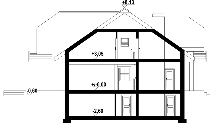 Wysokość ścianki kolankowej: 0.65 m. Strop: płyta żelbetowa. Pokrycie dachu: dachówka ceramiczna. Ściany zewnętrzne: pustaki ceramiczne + styropian. Ściany wewnętrzne: pustaki ceramiczne. Typ ogrzewania: kocioł gazowy lub kocioł na paliwo stałe. Instalacje dodatkowe: instalacja solarna.