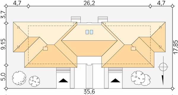 Graficzne opracowanie rzutów poglądowych widocznych na karcie projektu zostało wykonane przez Extradom.pl. Prezentowane przez Extradom.pl wizualizacje wykonane zostały przez autora projektu i należy poczytywać je jedynie za przykład i propozycję wykończenia, wizję architektoniczną autora projektu. Ostateczne wykończenie budynku może nastąpić na wiele sposobów. Szczegółowe rozwiązania zastosowane w oferowanej dokumentacji - w tym również ilość, lokalizacje i wygląd okien, drzwi, kominów - mogą w niewielkim stopniu różnić się od prezentowanej wizualizacji budynku.