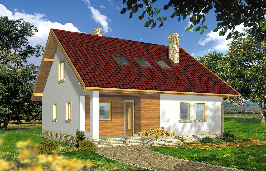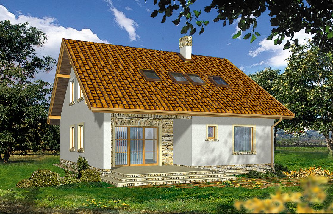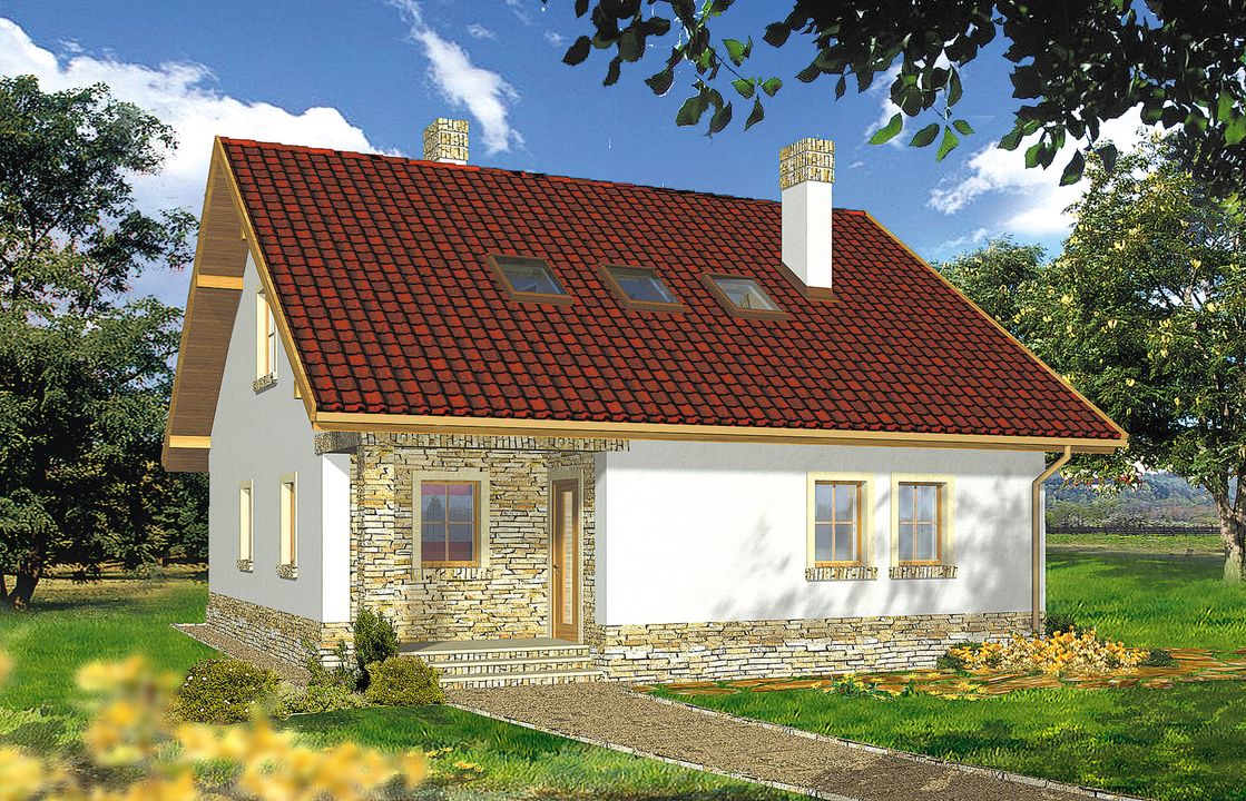 Konstrukcja ściany fundamentowe - bloczek betonowy; ściany zewnętrzne - beton komórkowy gr. 24cm + styropian Termo Organika Termonium Plus gr. 12cm; ściany wewnętrzne - bloczek silikatowy gr. 24cm; strop - Teriva; konstrukcja dachu - drewniana . Instalacje W projekcie przewidziano instalacjie: c.o. i c.w.u. zasilana kotłem na biomasę, grzejniki płytowe, instalacje wodno-kanalizacyjna oraz elektryczne, wentylacja grawitacyjna. Wykończenie pokrycie dachowe - dachówka cementowa (w ramach adaptacji inny materiał); ścianki działowe na parterze - bloczki silikatowe; na poddaszu z płyt gipsowo-kartonowych; schody drewniane - zabiegowe, okna - PVC, okna dachowe i wyłaz dachowy - Fakro. Okres oczekiwania: 2 tygodnie od daty zamówienia.